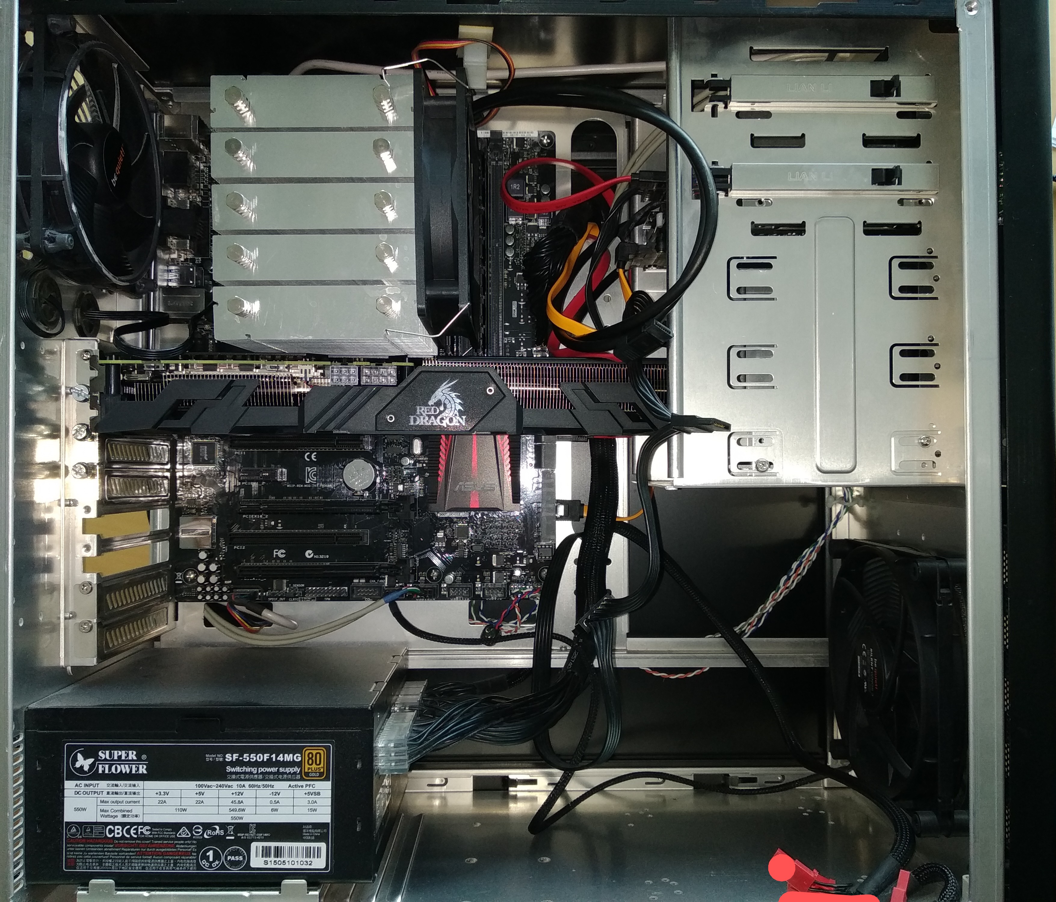 Die Grafikkarte hängt nur provisorisch unter dem CPU-Kühler. Wollte sehen ob die überhaupt da oben passt. Die steckt sonst untersten 16x PCI-E Slot.( Wo die Blenden fehlen)