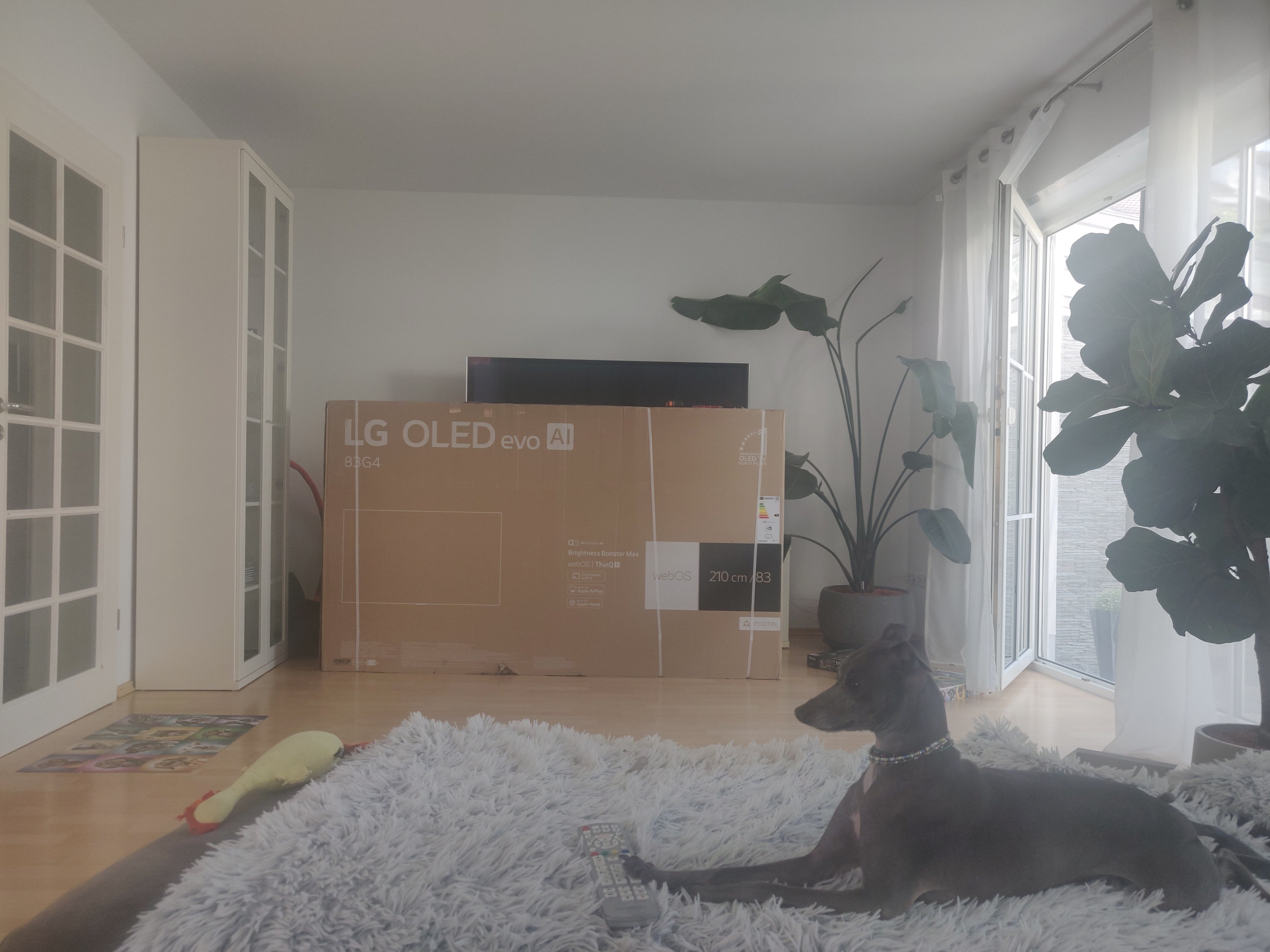 Der Riese wiegt ohne Standfuß ca 40kg, der kleiner ist mit 37kg nicht viel leichter, das geht ok., jedoch fühlt sich der 83" samt Karton, als würde das doppelte wiegen, ok da ist noch die FB drinnen 😂