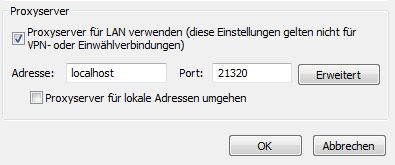 Ich habe Proxy ausgestellt, weiß aber nicht wie ich wieder den richtigen Proxy eingeben kann. Mit localhost:21320 geht es jedenfalls nicht.