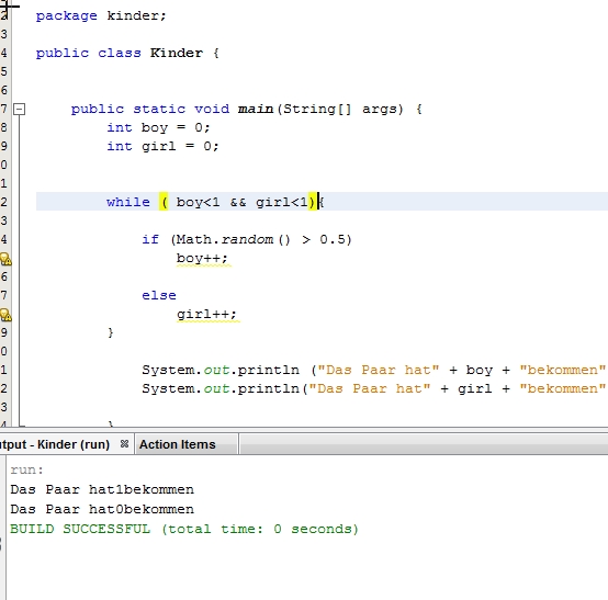 Die Aufgabe lautet: Ein junges Paar beschließt so lange Kinder zu haben, bis sie mindestens einen Jungen und ein Mädchen haben. Schätzen Sie die Anzahl der Kinder die das Paar haben wird mittels einer Simulation.