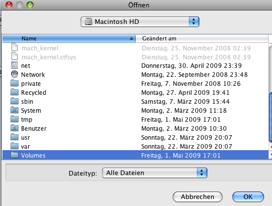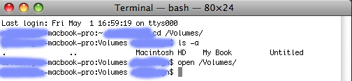 3. Tipps du open /Volumes/ ein dann öffnet sich der Finder und er zeigt die Festplatten an