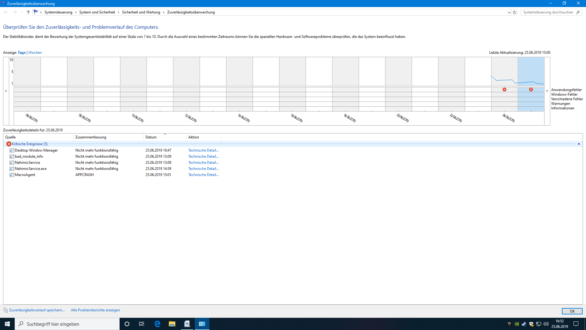 Ok, zumindest zeigt der Zuverlässigkeitsverlauf keine Hardware Fehler (Kernel Fehler z.b.) an.