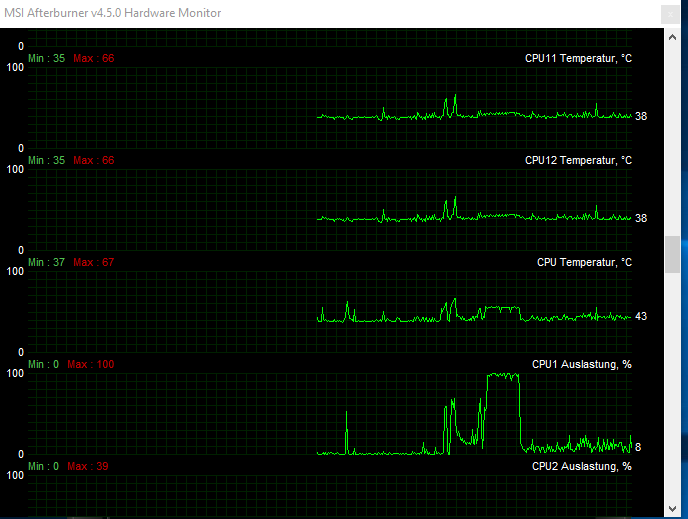 CPU1 Usage fällt von 100% auf 85% runter...generell wird größtenteils nur CPU1 und CPU6 benutzt und alles andere liegt brach....hmmm.