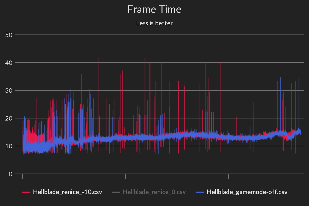 gamemode off hatte die besten Frametimes, gamemode mit renice -10 die schlechtesten.