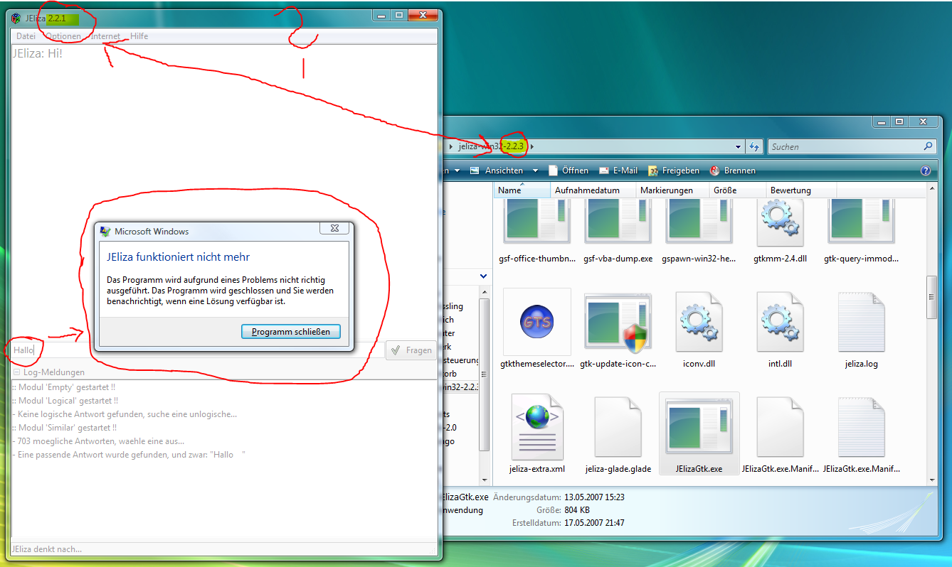 ausserdem funktioniert das ganze nicht wenn mans von ner verknüpfung aufm desktop startet: dann passiert nämlich gar nix ausser dass eine jeliza.log aufm desktop erstellt wird.