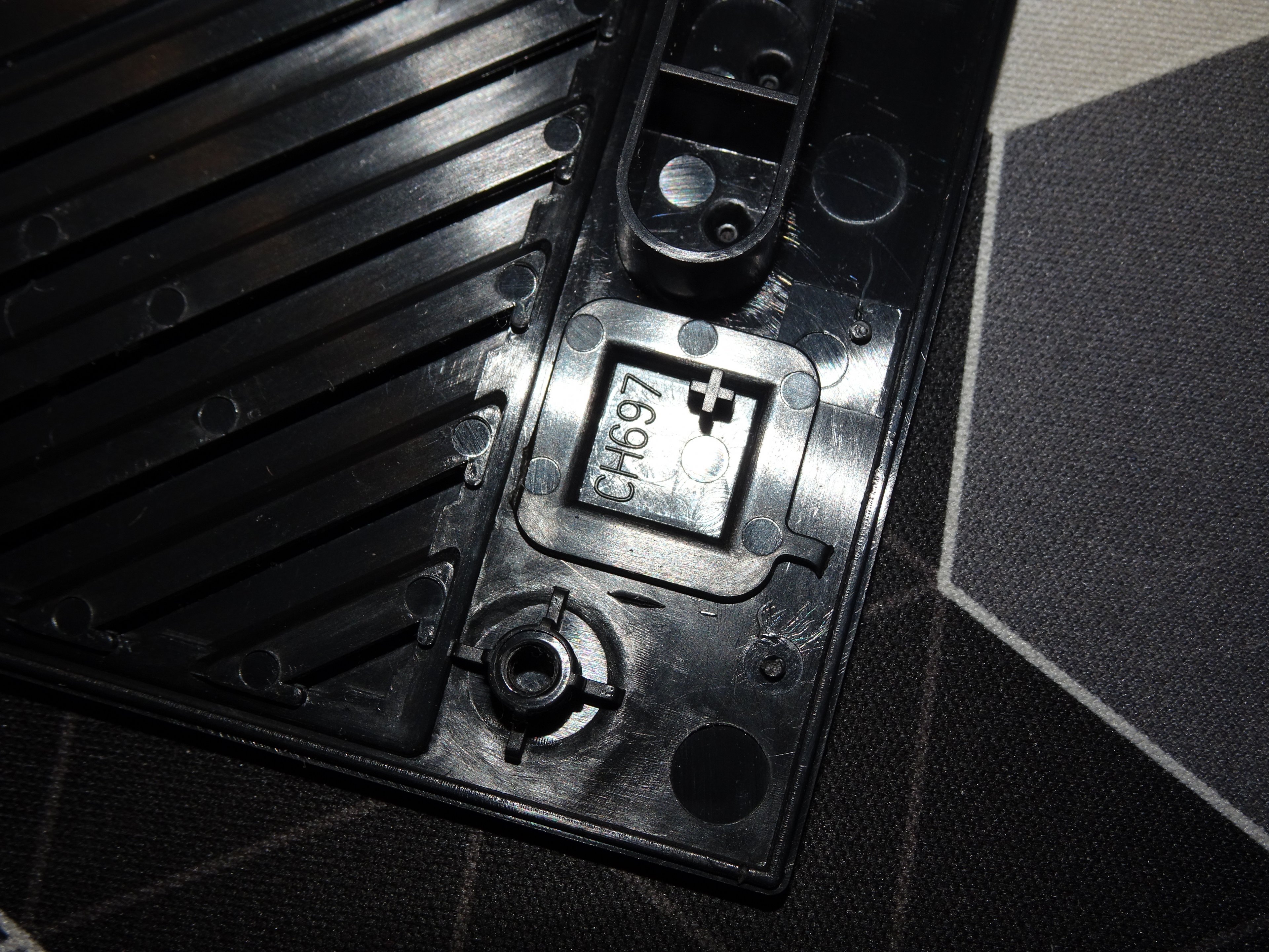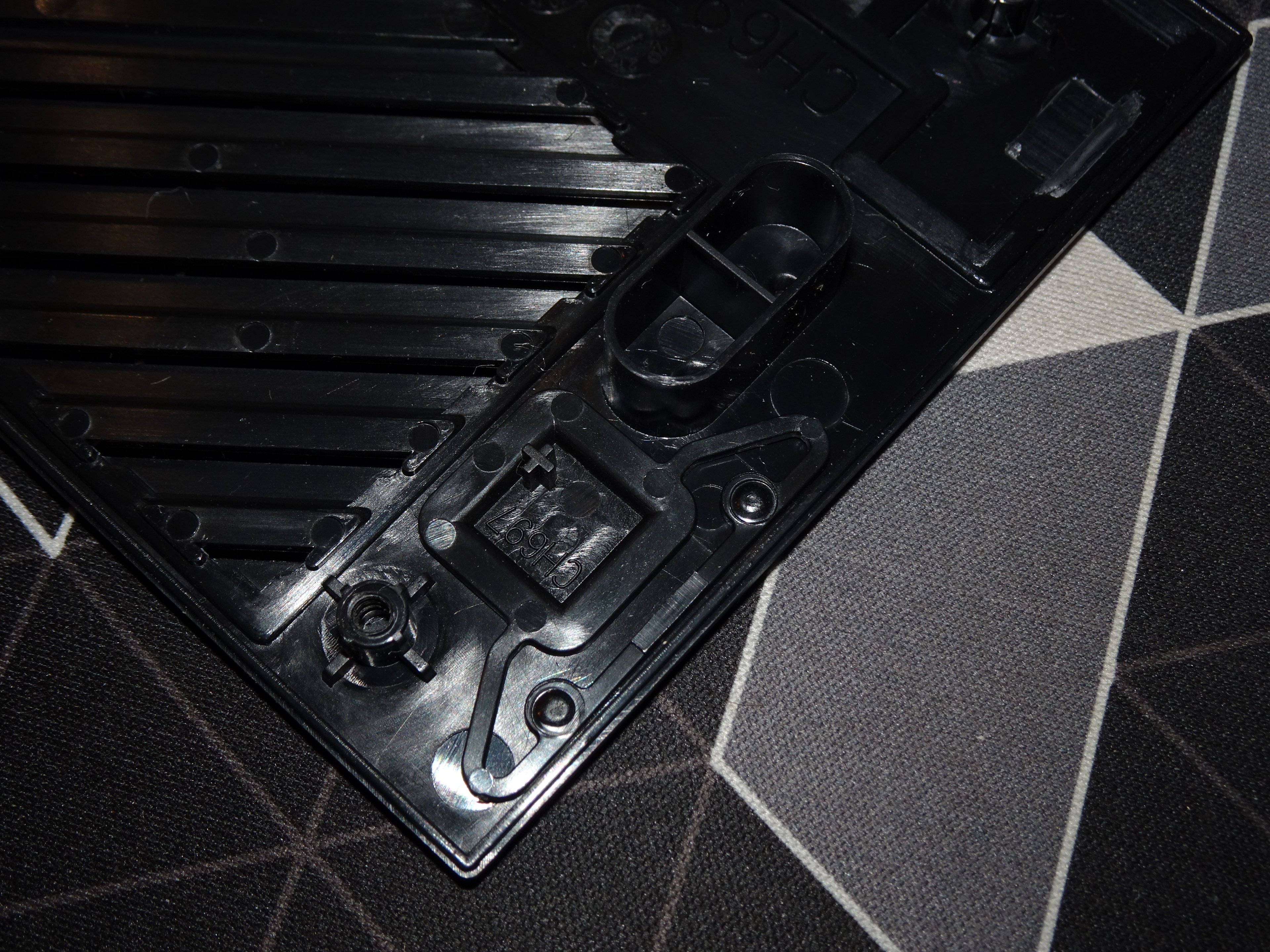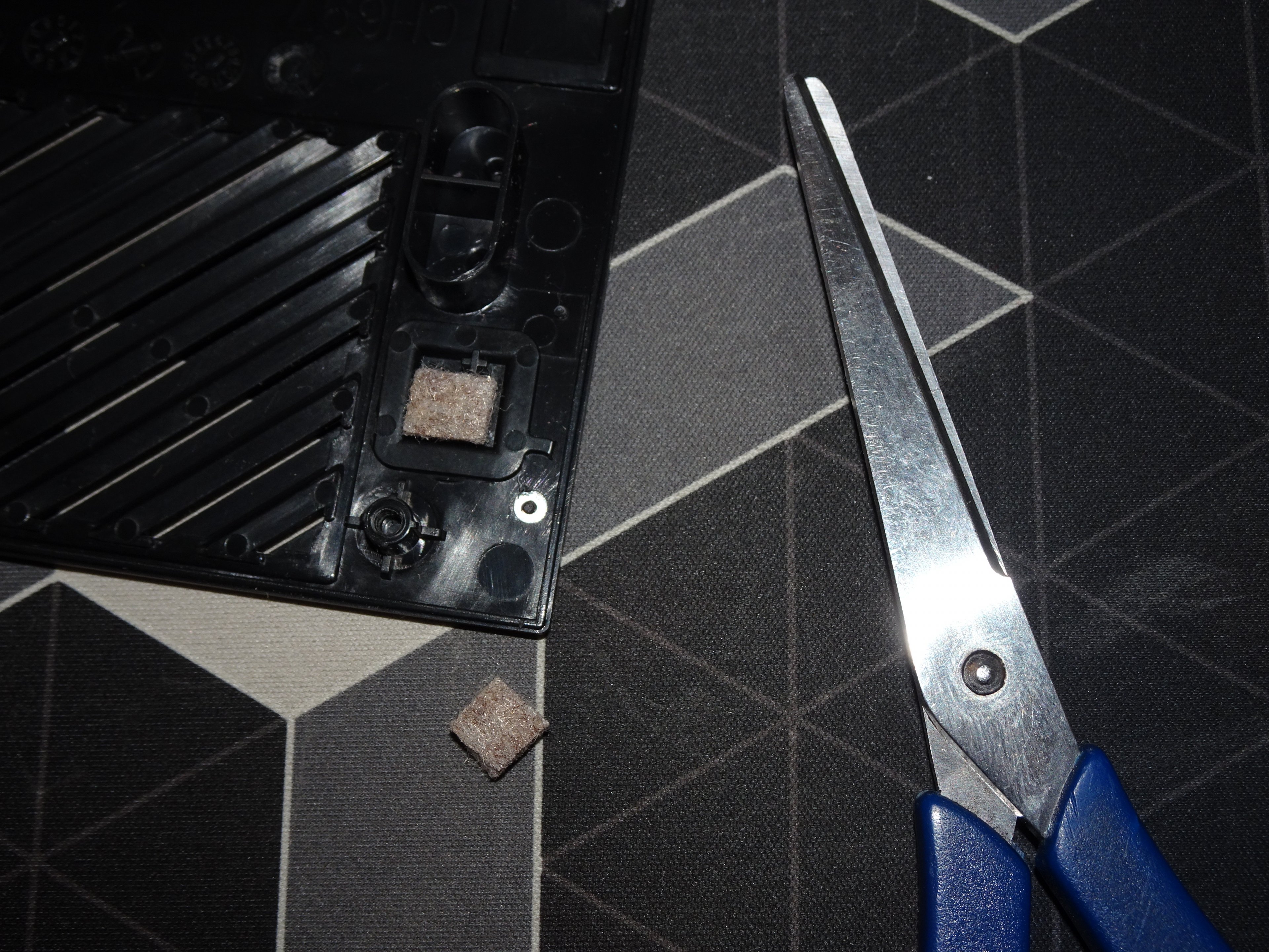Das hat mich dazu gebracht, die Frontblende abzuschrauben, den Knopf herauszuschneiden und gedreht wieder reinzulegen. Weil die kreuzförmige Plastiknase nicht zentriert ausgerichtet ist, trifft sie den Taster nicht mehr, er fällt zu weit ins Gehäuse rein und lässt sich nicht mehr drücken. Die Plastiknase habe ich herausgeschnitten und ein Stück von einem Filzgleiter eingeklebt und das Filz mit einem Tropfen verhärtet - passt.