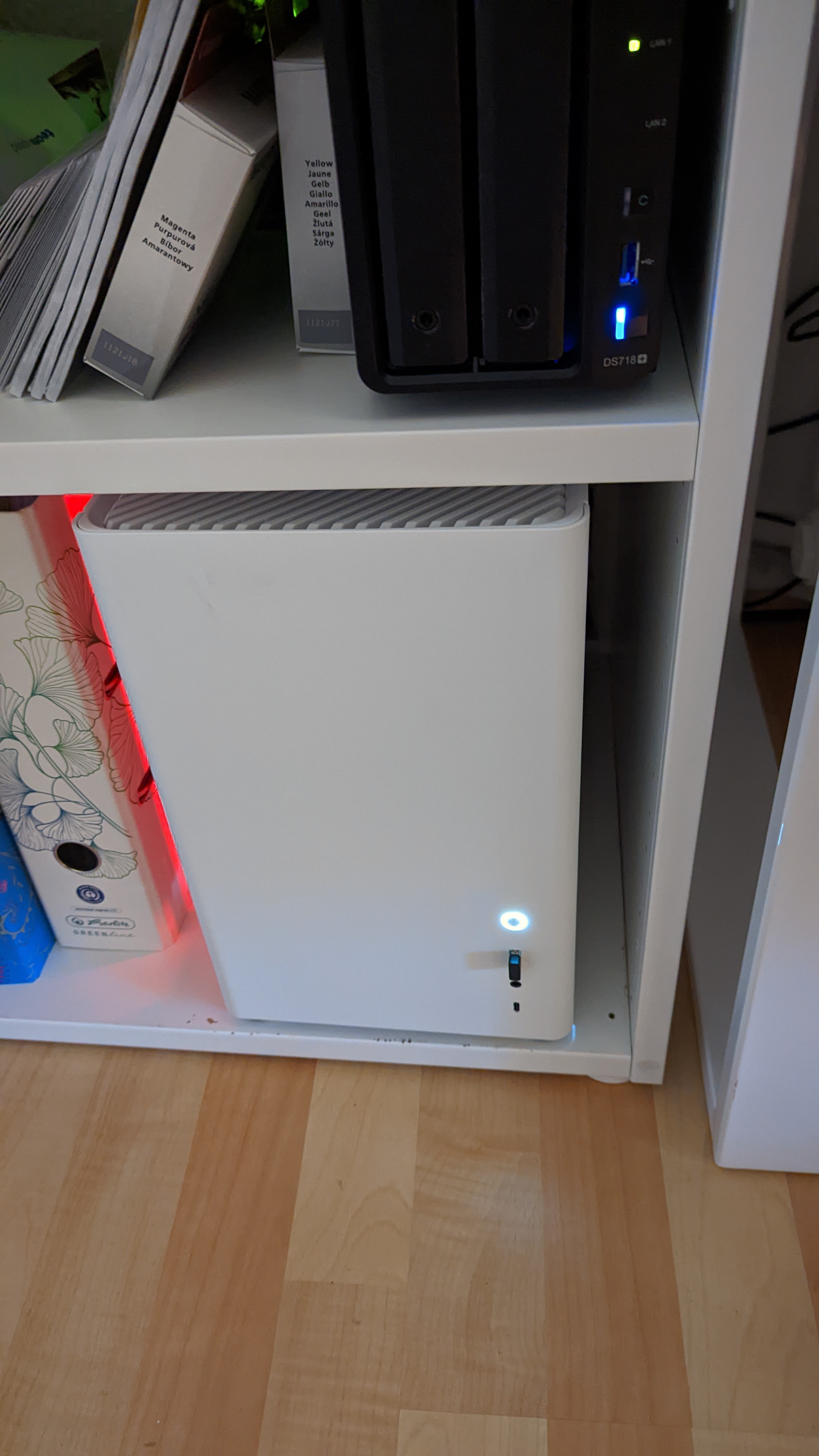 Temperaturen muss ich mal schauen. Vorher hatte ich immer knapp unter 40 Grad, ein 200er Lüfter unten (rein), ein 120 oben (rein) und ein 140er hinten (raus). Aktuell fehlt hinten noch der ausblasende Lüfter, der kommt übermorgen. Ansonsten bläst ein 140er oben und ein 120er unten rein. Finde das die beste Lösung, weil oben fast kein Platz im Schrank ist. Temperatur aktuell um die 35 Grad. Schon ganz gut, ohne hinteren Lüfter. Der 5600G ist natürlich auch kein Hitzkopf, dazu keine GraKa.