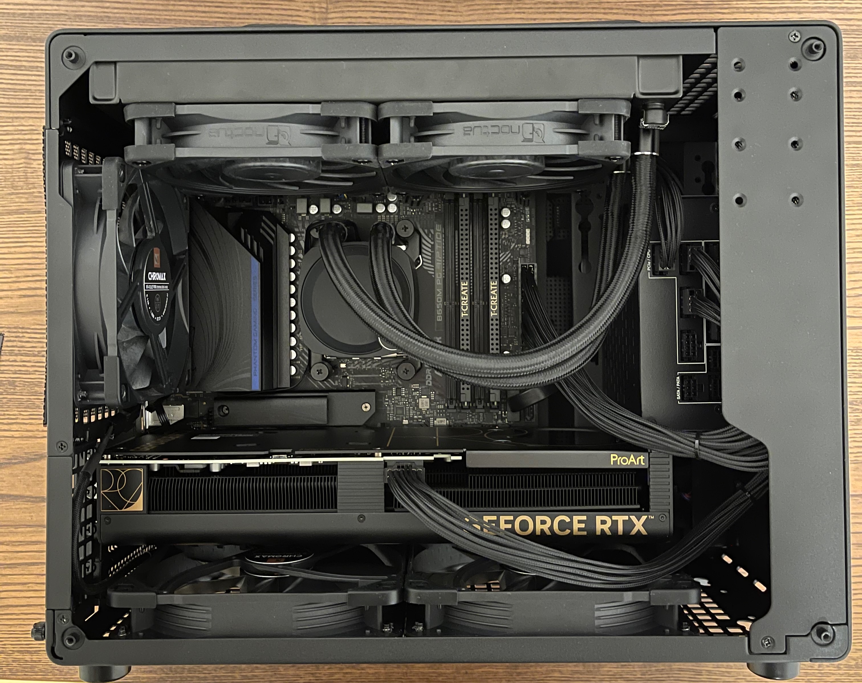 Oben sollen 2 140er rausblasend eingebaut werden. Hinten ein 120er einblasend, der den Towerkühler mit frischer Luft versorgt. Der Towerkühler selbst hat 2 Lüfter (Scythe Fuma 2).