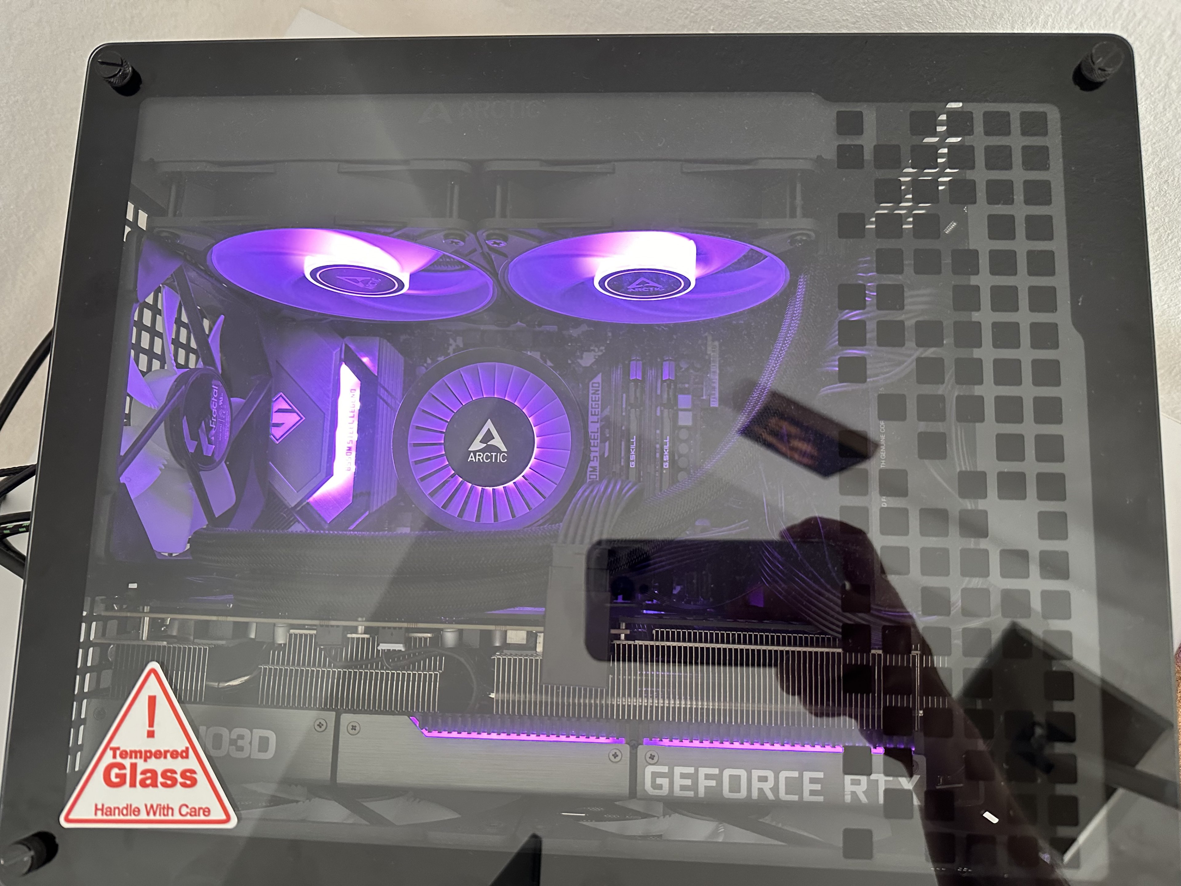 Hinten kann ich meine Hand noch zwischen RAM und die AIO schieben, die Schläuche kommen auch dem Netzteil nicht in die Quere.