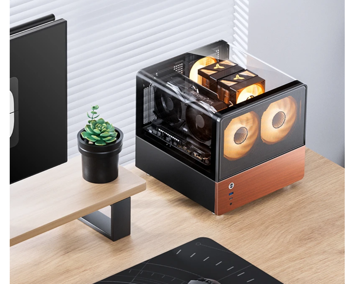 News Jonsbo T7: Micro-ATX-Gehäuse steht quer und auf einem „Holzsockel“