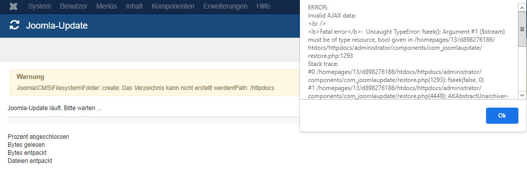 Ich betreibe eine Joomla Webseite. Nach dem Umzug nach IONOS kann ich kein Update mehr machen. Folgende Fehlermeldung wird angezeigt. Hat hier jemand eine Idee?