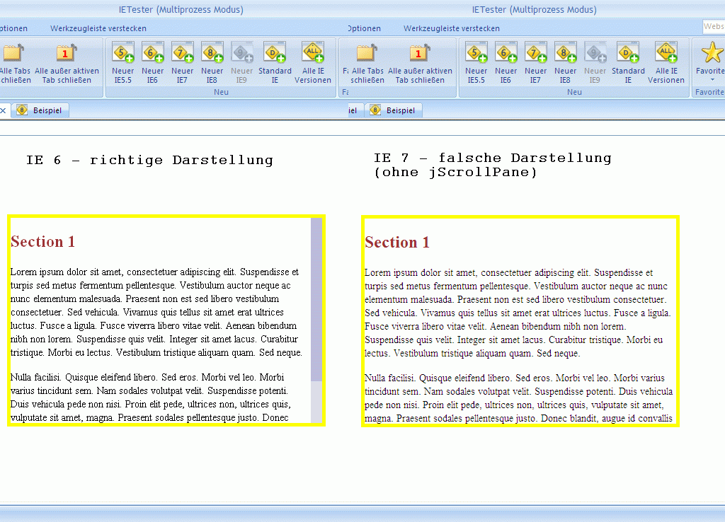 ich habe eine HTML-Seite, die mit SerialScroll und jScrollPane (beides jQuery Erweiterungen und haben nichts mit dem JScrollPane in der Programmiersprache Java zu tun ;-)) "aufgewertet" ist. Nun ist mir dabei eine Sache passiert, die mir relativ selten passiert: der IE 6 zeigt alles (und der IE 8 und der Firefox und der Opera und der Safari) können die Testseite einwandfrei an. Nur der IE 7 gibt "Mist" aus: