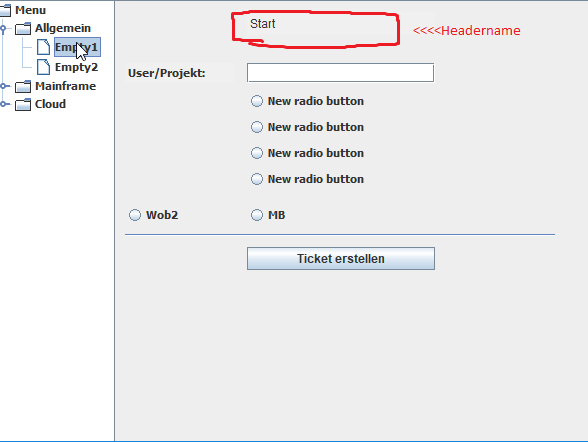 Über den TreeSelectionListener lasse ich mir den Pfad als String zurückgeben. Diesen verwende ich momentan nur um den Headernamen des CloudPanels ändern zu lassen. Dieser bleibt aber wie bei der Initialisierung auf "Start" (Bild1)