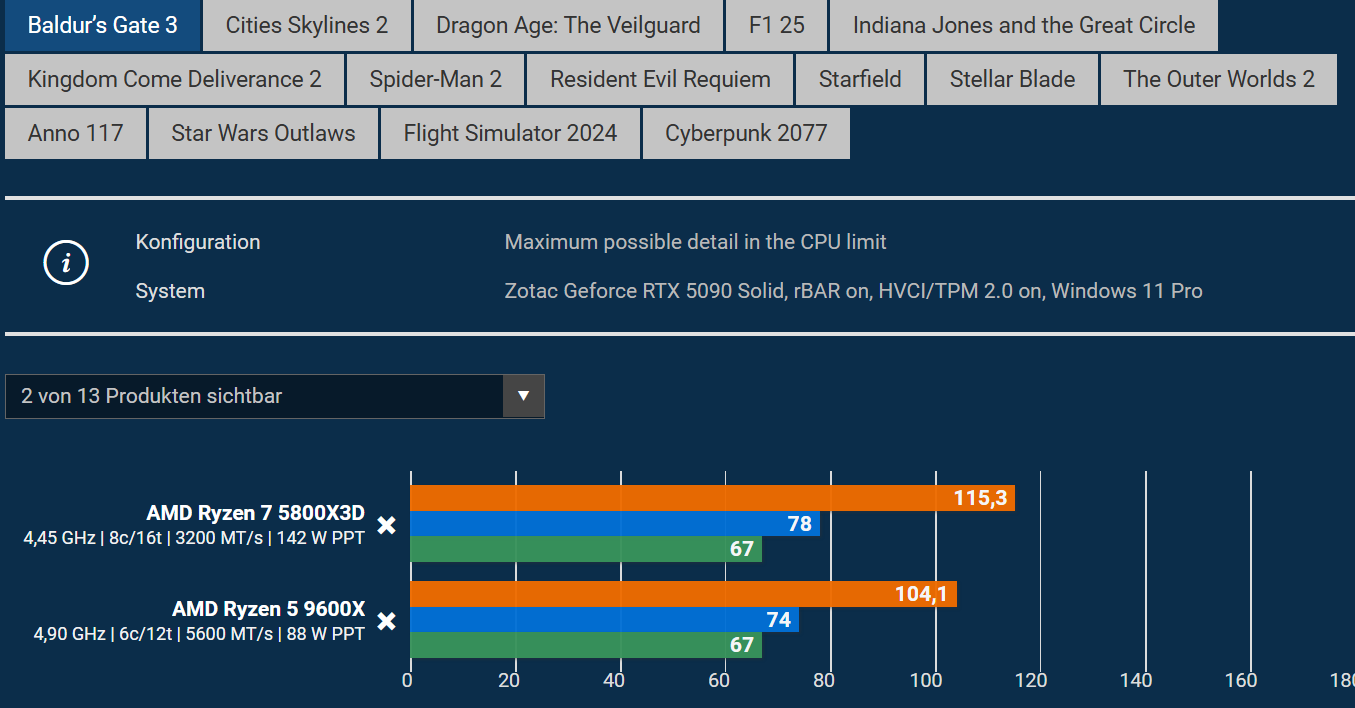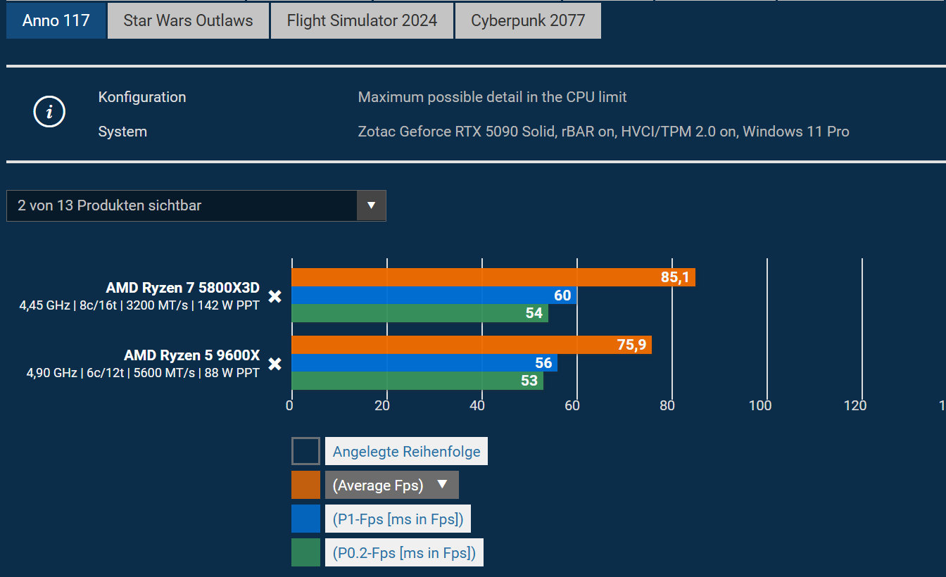 Das mach ich mit nem 5600er. Vor der PS6 und deren Specs gibts keine Upgrades mehr -- die PS5+Pro ist trotz weniger Overhead auch am PC spürbar noch Zen2. Und die Specs der PS6 werden die Basis bis weeeeit in die 2030er Jahre bilden. Bis dahin schlägt jede Budget-CPU AM4-X3Ds -- im Mittel ist man ja schon mit nem 7600er gut dabei.