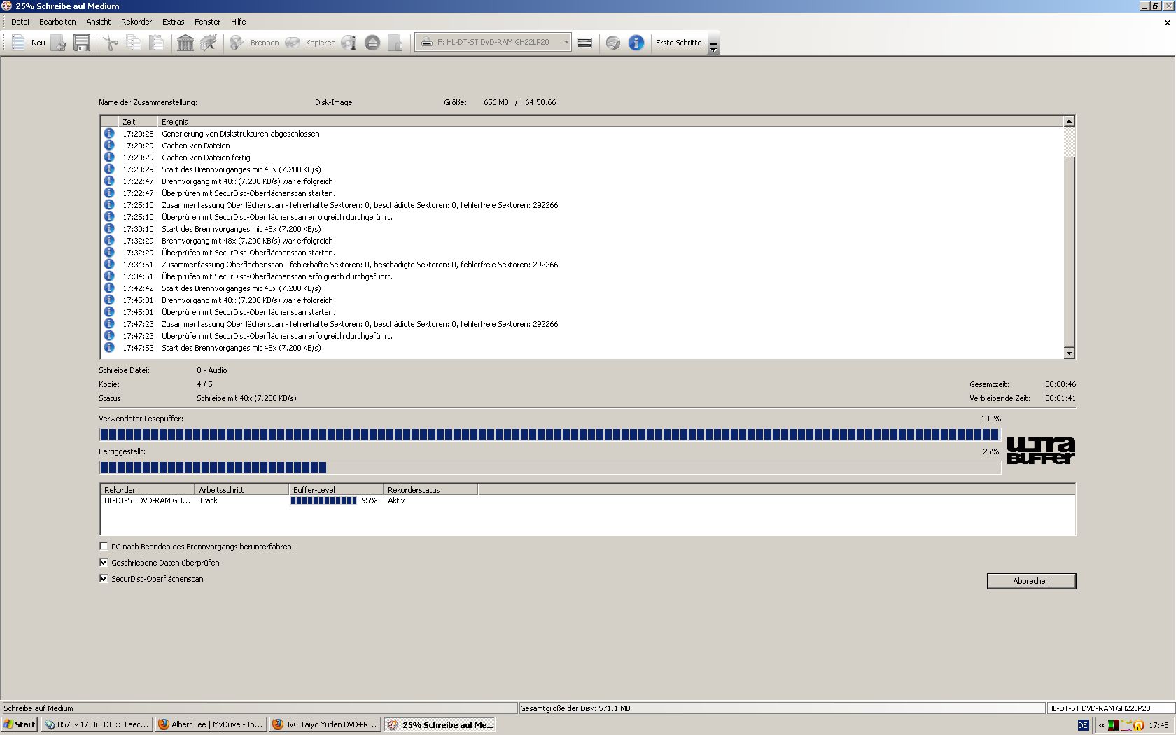 Aufgrund ihrer guten Druckeigenschaften habe ich mir nun mal ein Paket JVC DVD+R (Taiyo Yuden) zugelegt. Leider schlägt bei diesen der Verfizierungsprozess mit beiden Programmen ständig fehl (Miscompare at LBA... etc.)