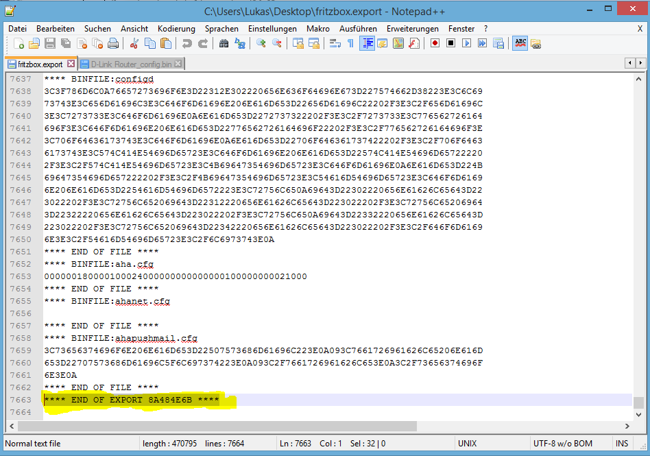 Das "xxxxxxxx" ist die Korrekte Prüfsumme. Diese muss nun in die fritzbox.export eingetragen werden. Dazu ganz runter scrollen und die Prüfsumme durch die alte hinter "**** END OF EXPORT " eintragen (Buchstaben groß machen!).