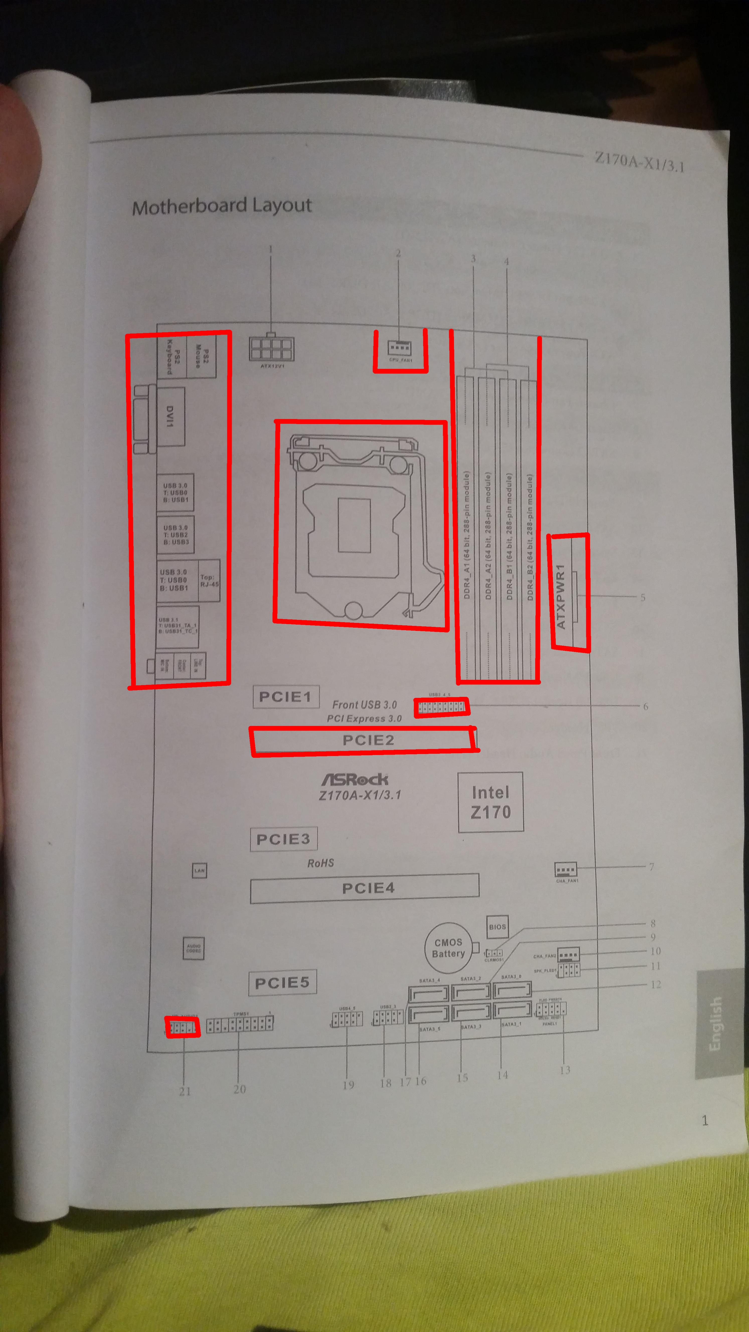 Auf den Bilder sind man mein Build und das Mainboard laut Handbuch. Alle Rot markierten sind bekannt, der rest nicht. Das größte Problem wie zum Teufel wird die 1070 ans Mainbord angeschlossen.