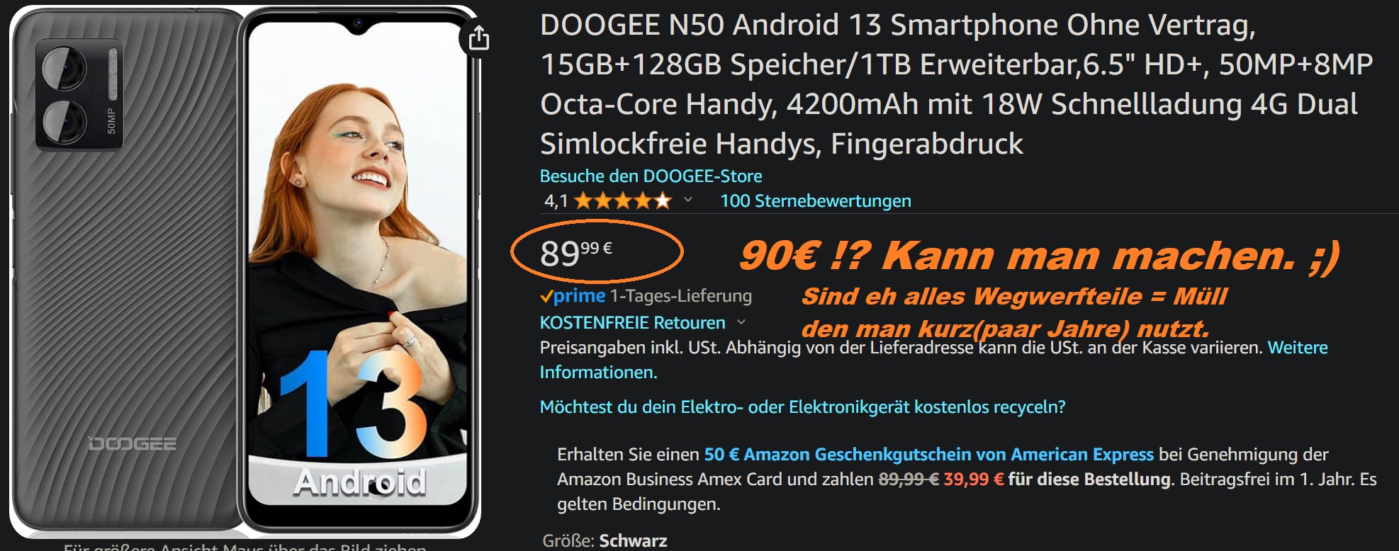 Das N50 von Doogee kriegt man gerade für 90€. Und das kann eben auch alles, was ich brauche, hat 8 GB Ram und 128GB Speicher fest, sprich hat mehr Ram und internen Speicher als mein altes "Mittelklassehandy"(hatte 6GB Ram und 64GB Speicher).