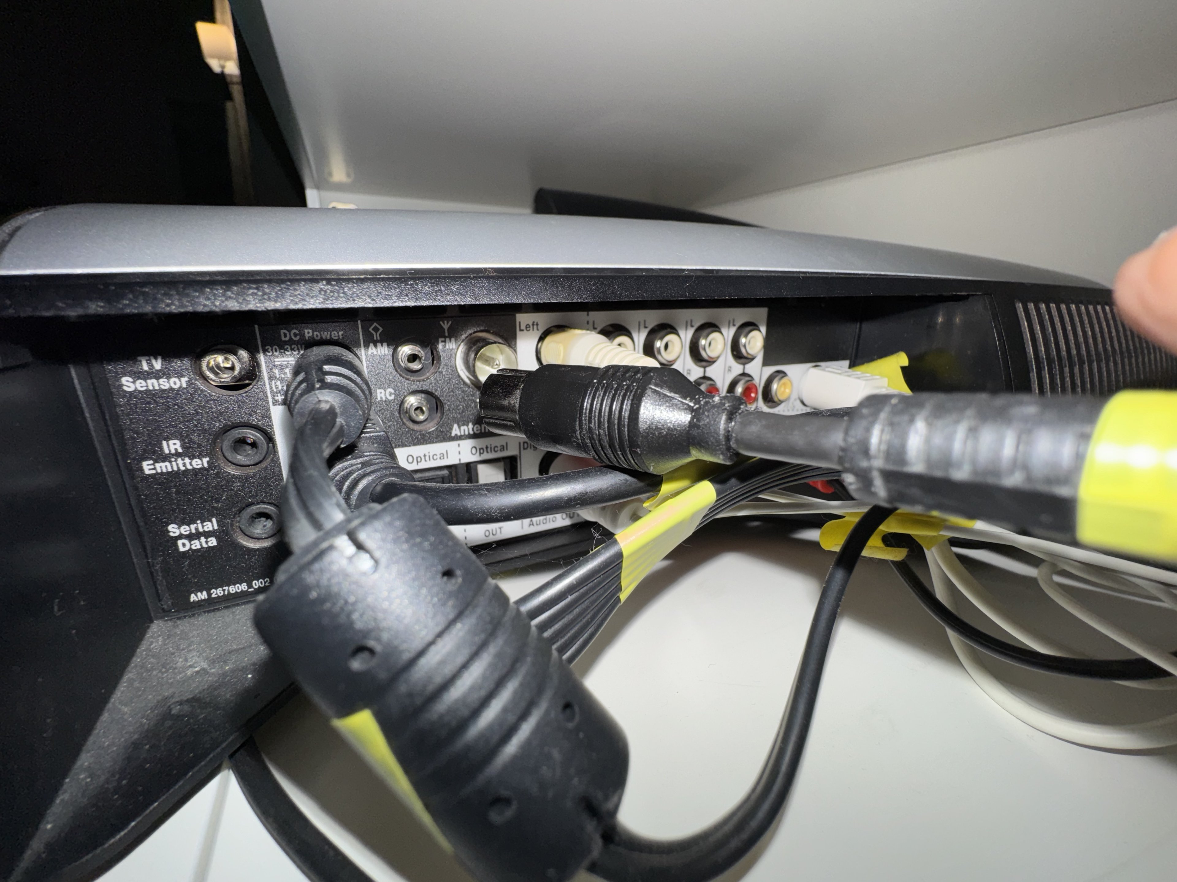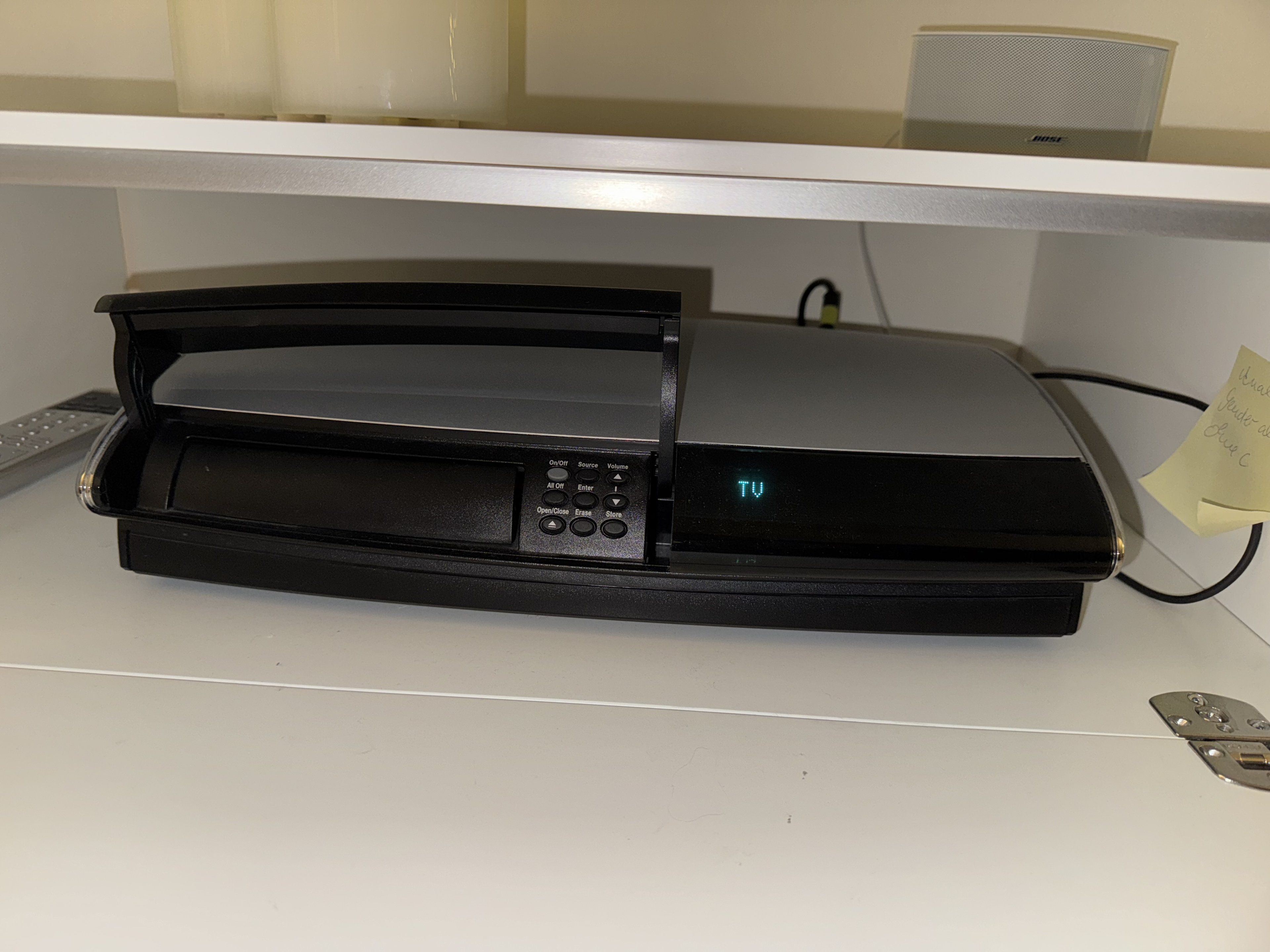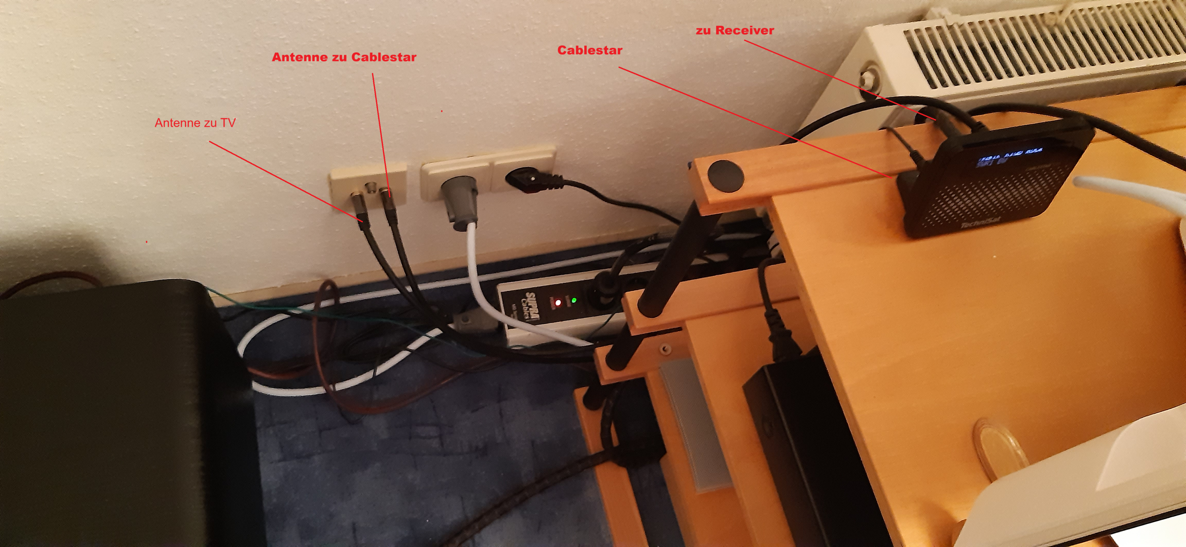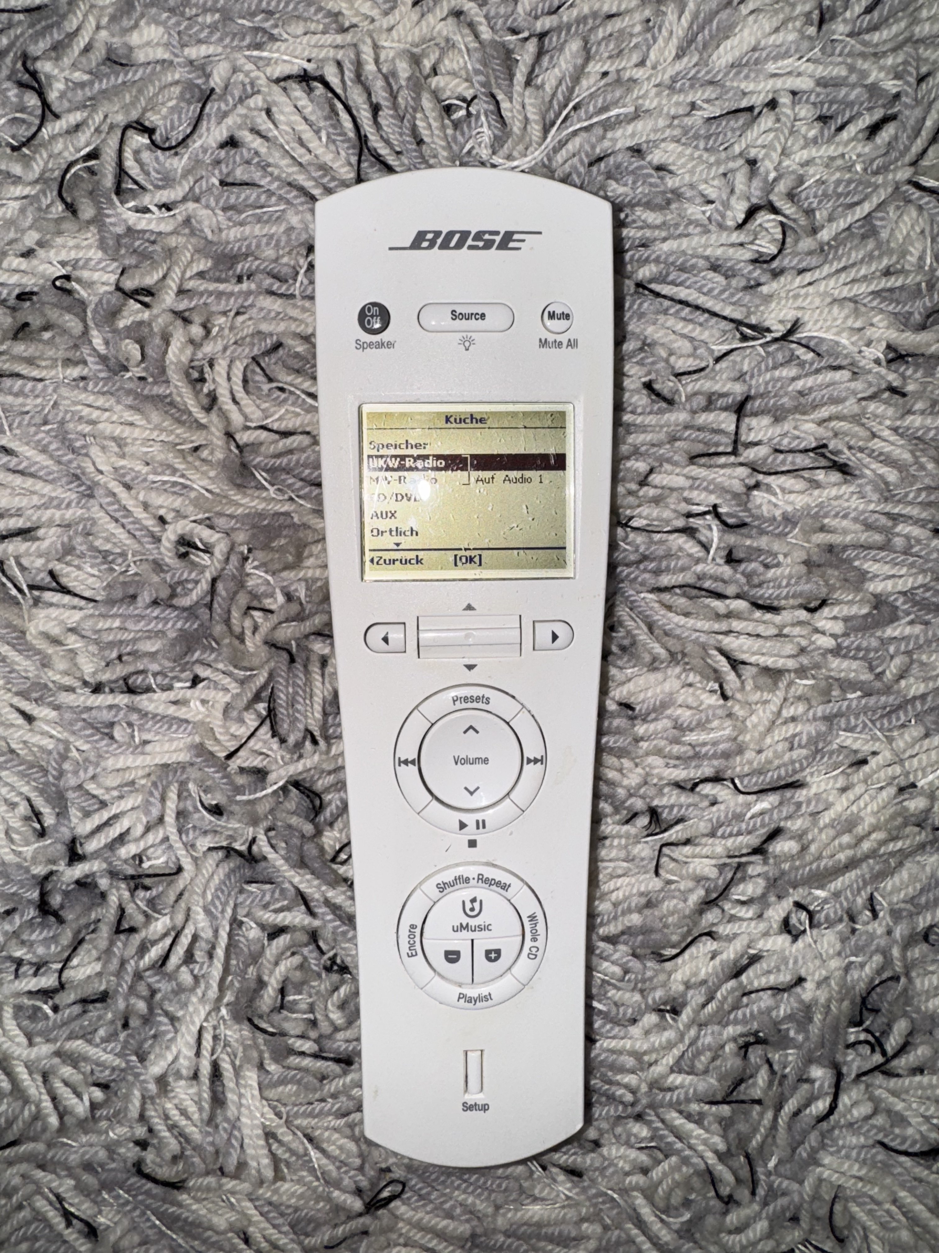 Die Geräte die wir haben müssen wir unbedingt behalten, weil der Fernseher auch darüber läuft. Der Reciever hier stehr im Wohnzimmer in einer flachen Nische und ist glaube ich für den Ton der Audioanlage (TV) im Wohnzimmer zuständig. Darüber empfangen wir aber auch das Radio aus der Kabelbuchse und ausgegeben wird der Ton über Lautsprecher in der Küche. Für die Steuerung haben wir extra eine Fernbedienung in der Küche.