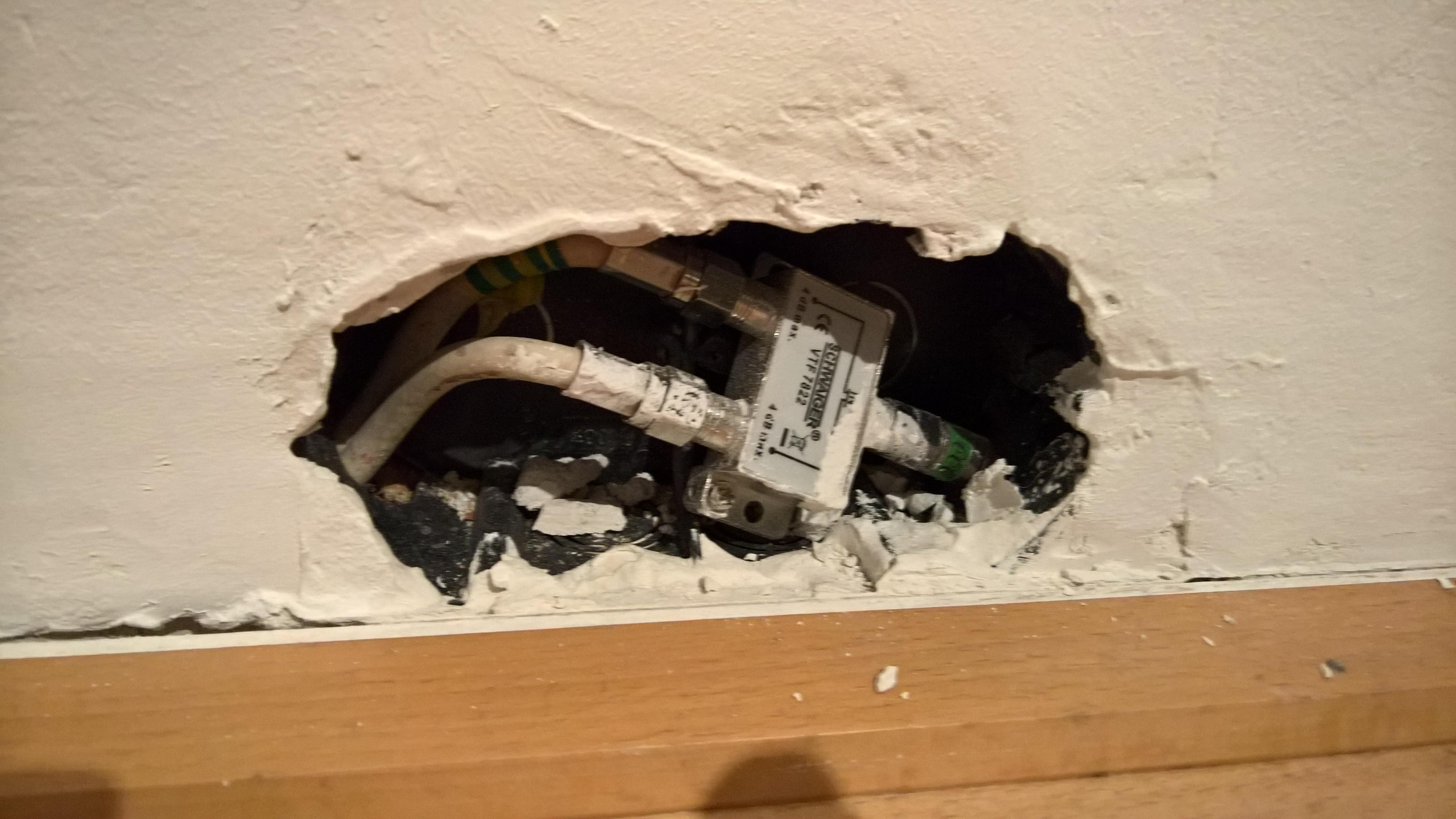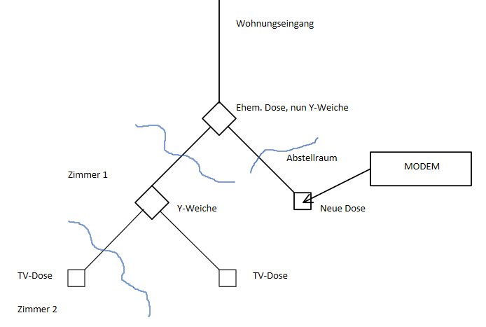 Wie ich eingezogen bin war nur eine einzige Kabel-TV-Dose am Gang installiert, allerdings lagen daneben offene Kabelenden die zu weiteren Dosen in den Zimmern führten. Mit ebenfalls in der Wohnung zurückgelassenen Y-Verteilern kann man tatsächlich alle Dosen miteinander verbinden, so ausgelegt ist es anscheinend.