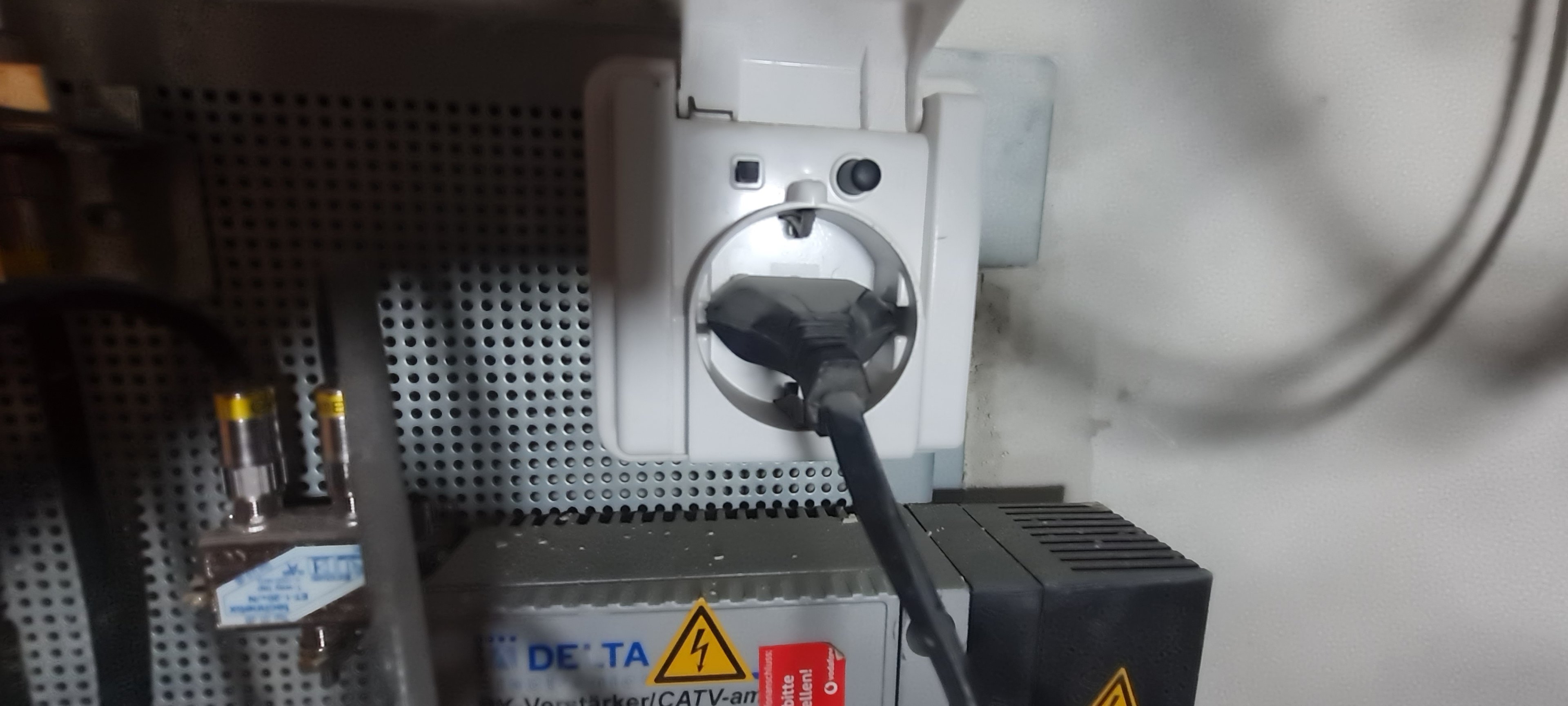 Über der Steckdose ist an den Rohren gearbeitet worden. Die Messing Stopfen sehen neu aus. Da ist vermutlich etwas Wasser ausgetreten und auf die Steckdose gelaufen. Das hat dann entweder den Fehlerstrom Schalter oder die Sicherung ausgelöst. Deshalb kein Strom keine Verstärkung.