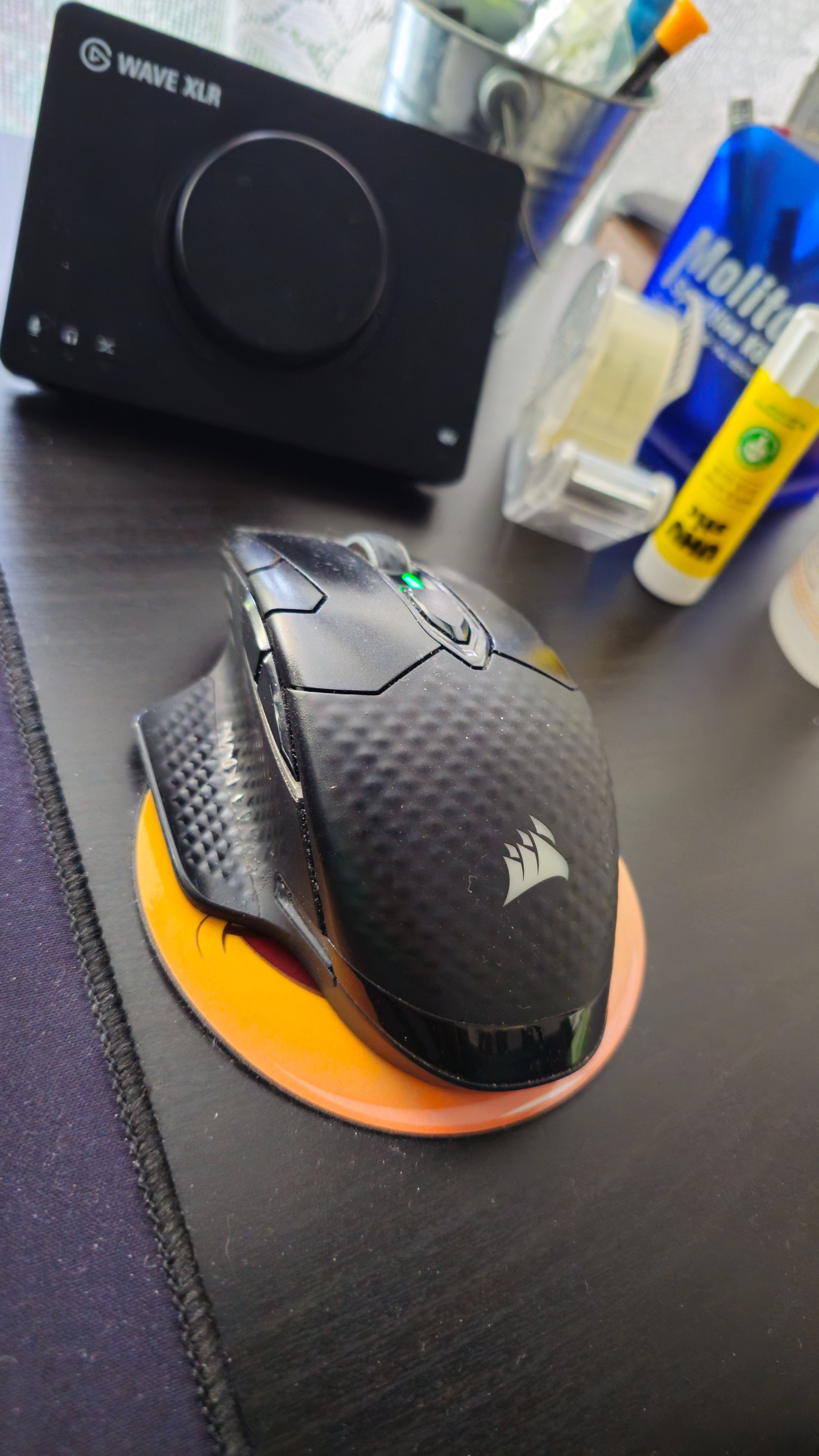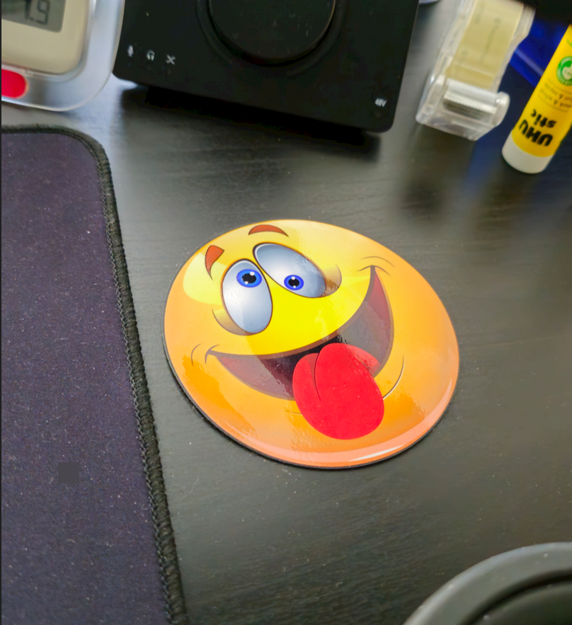 Auf der Oberseite wird dann noch ein dünner Pad aufgeklebt, was ich mit einem Smiley-Aufkleber überklebt habe. Das dient mir, um die genaue Position besser finden zu können. Wobei es mit einem Handy nicht so genau sein muss. Denn ein Handy setzte ich genau mit der Mitte darauf. Mit der Maus visiere ich die untere Zunge auf dem Smiley mit der unteren Kante der Maus und dann passt es so.