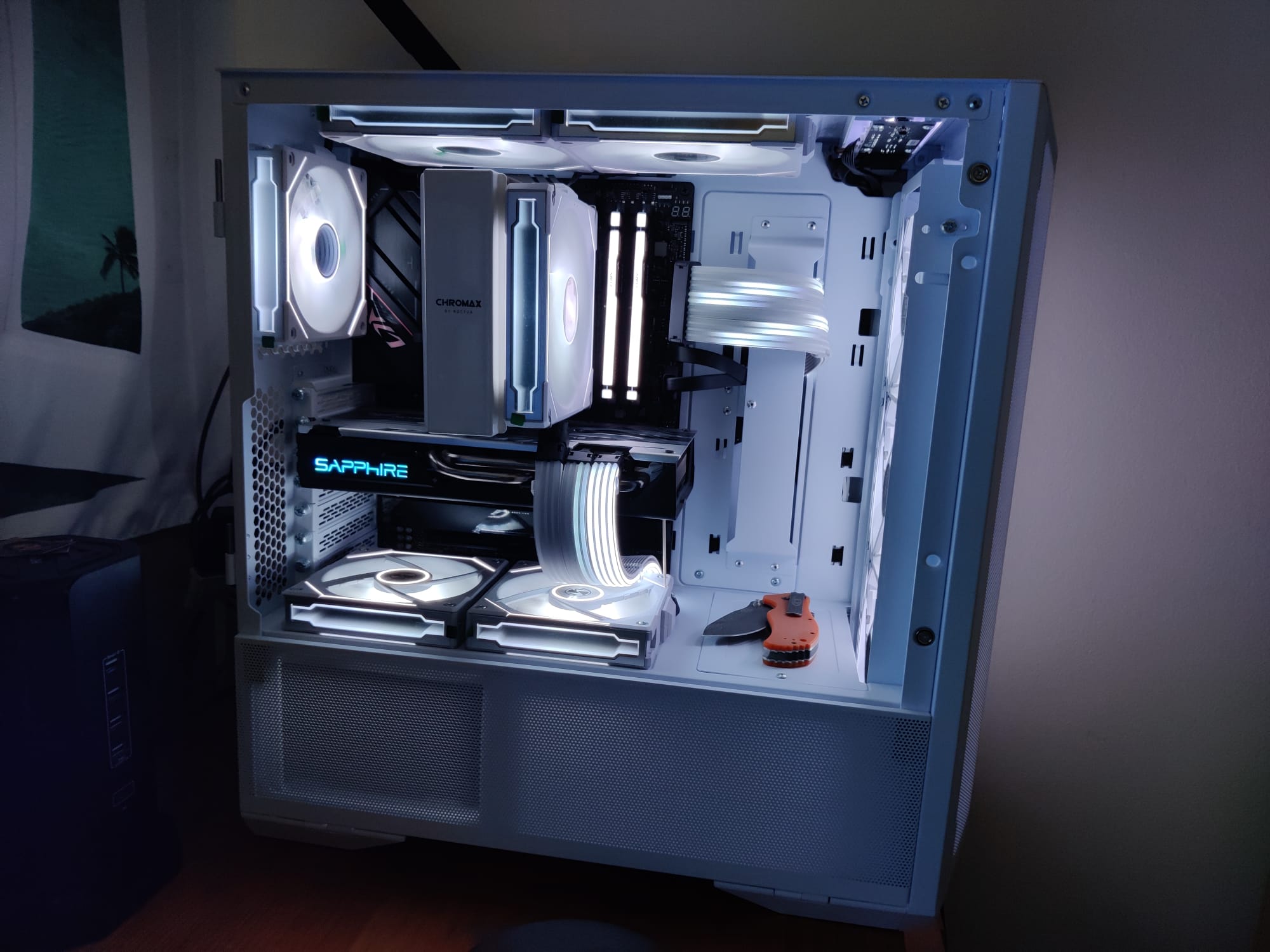 Aber aufgrund der vielen RGB Komponenten, in Verbindungen mit den Steuergeräten dafür, die die Anschlüsse in alle Himmelsrichtungen haben, und den Verlauf der Kabel der in alle Ecken des PCs führt, bin ich mit dem Kabelmanagement dieser etwas überfordert, ich habe keinen Plan wie oder wo ich da etwas sortieren könnte um etwas Ordnung hinein zu bekommen.