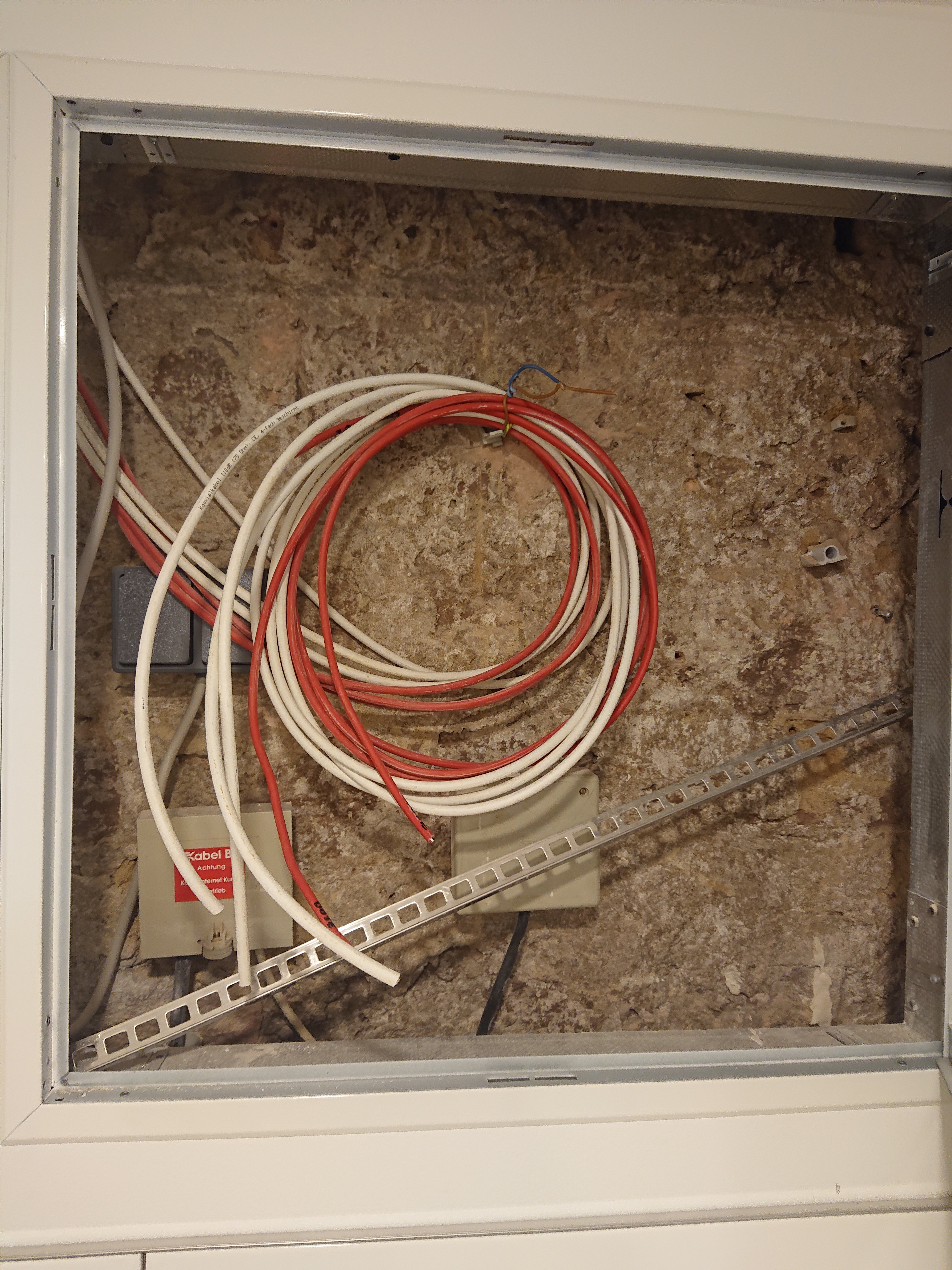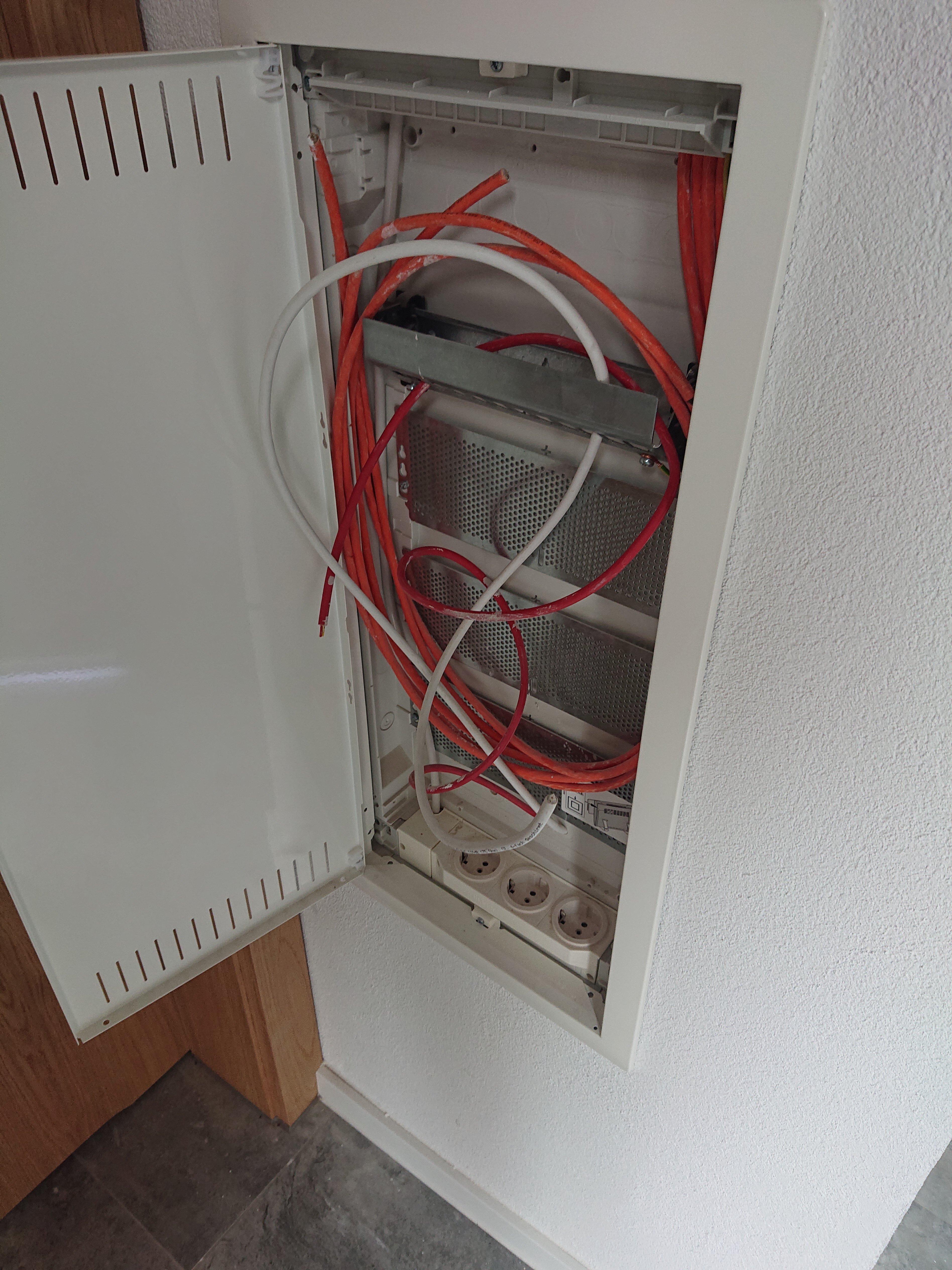 Alle Zimmer sind mit LAN Kabeln versehen die zu einem Hager Volta Multimedia Verteilerkasten im Flur führen. Allerdings hängen die Kabel dort einfach ab ohne Anschlüsse oder Stecker (siehe Foto). Vermutlich müssten dort (vom Elektriker?) noch die Stecker auf die Kabel gesetzt werden? Ebenso in den Zimmern sind noch keine Dosen verbaut, nur die Kabel liegen in der Wand.