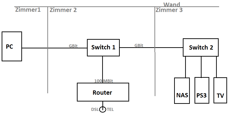 Ich habe in dem Bild mal aufgemalt wie ich mir das vorstelle. Im Zimmer_2 liegt der Telefonzugang. Der Router ist ein 100Mbit Router, also brauch ich natürlich GBit-Switches.