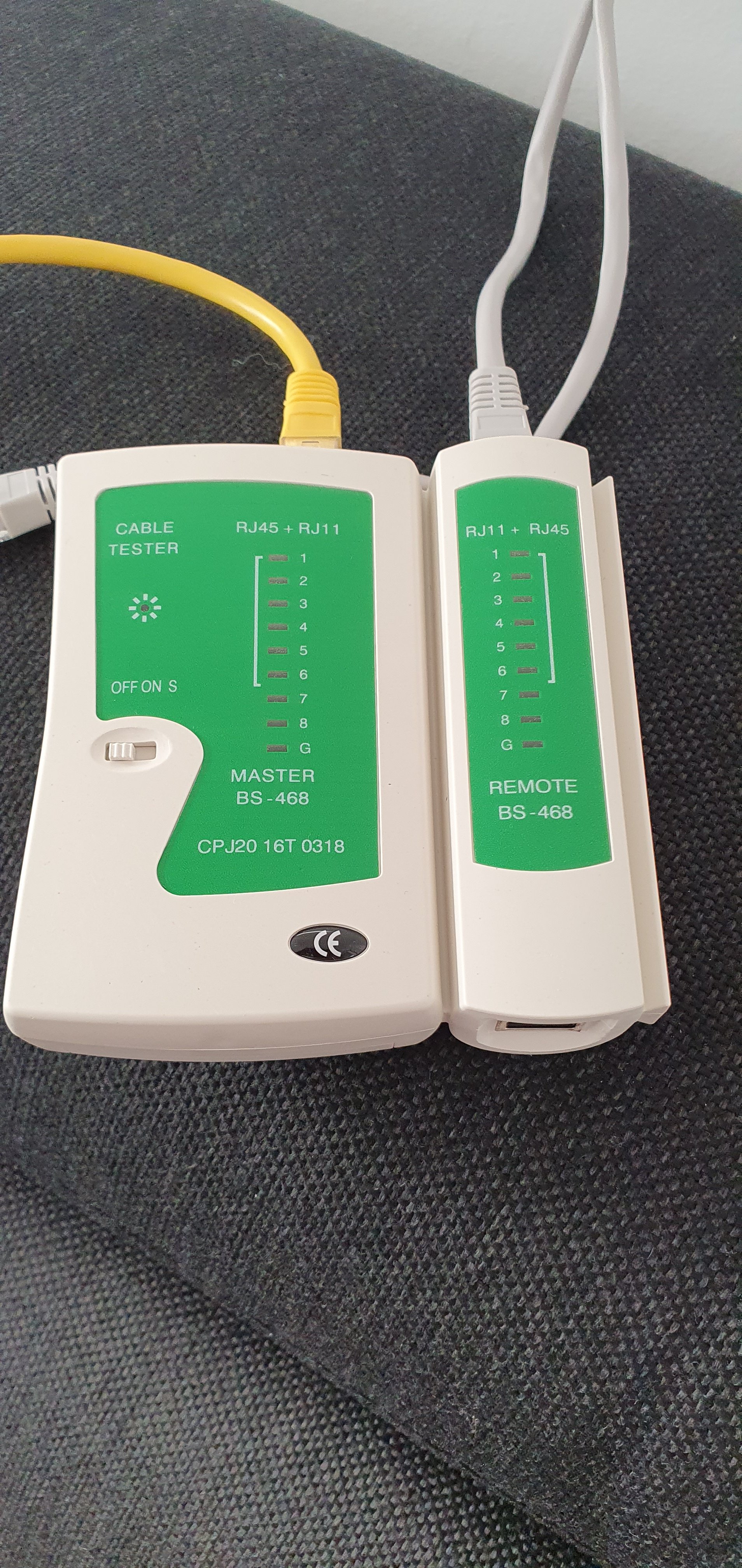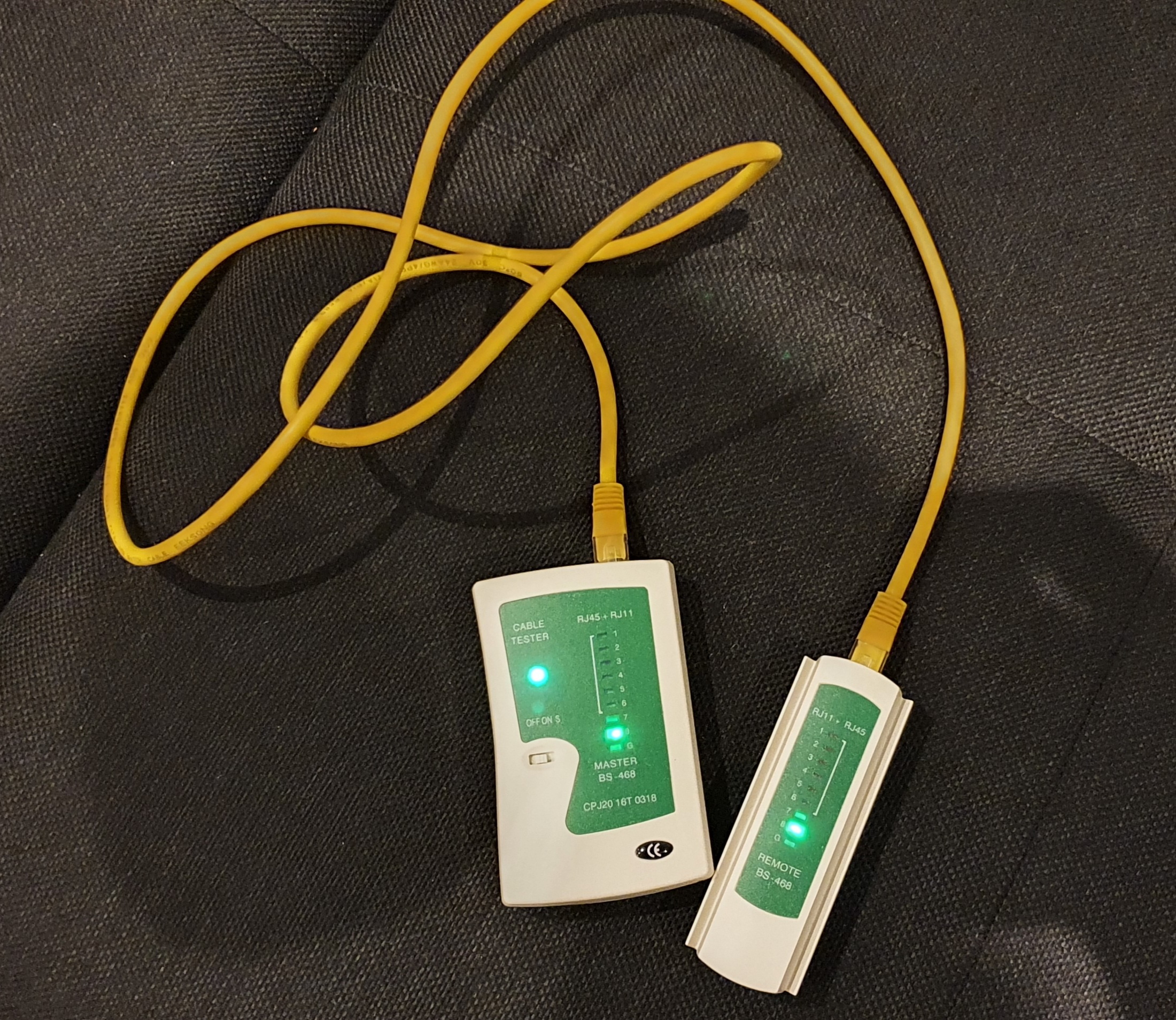 So ein Netzwerkkabeltester kann ich nur jedem Newbie, der mal sein Netzwerk im Haus testen will, empfehlen. Ist nicht teuer und man sieht sofort, was falsch ist. Habe natürlich auch Fehlschläge gehabt, d.h. der Kabeltester hat auch mal wild hin und her von 1 auf 3 auf 2 auf 7 auf 5 usw. geleucht. Einfach abmachen und neue anlegen und schon leuchtet es in der richtigen Reihenfolge auf.