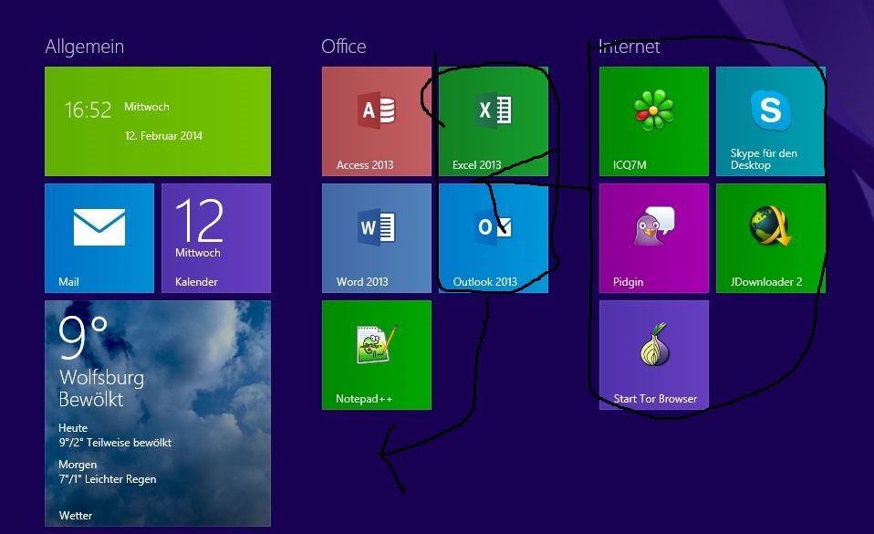Ich möchte die Excel und Outlook Kacheln unter Notepad++ bekommen. So das dort nur eine reihe mit kleinen Kacheln sind. Und dann soll die Kacheln mit den Internet Kram einfach ein wenig weiter nach Links aufrücken. Aber irgendwie bekomme ich die Kacheln unter Office nicht unter einander. Es gehen immer nur zwei in einer reihe. Kann man das irgendwo ändern?