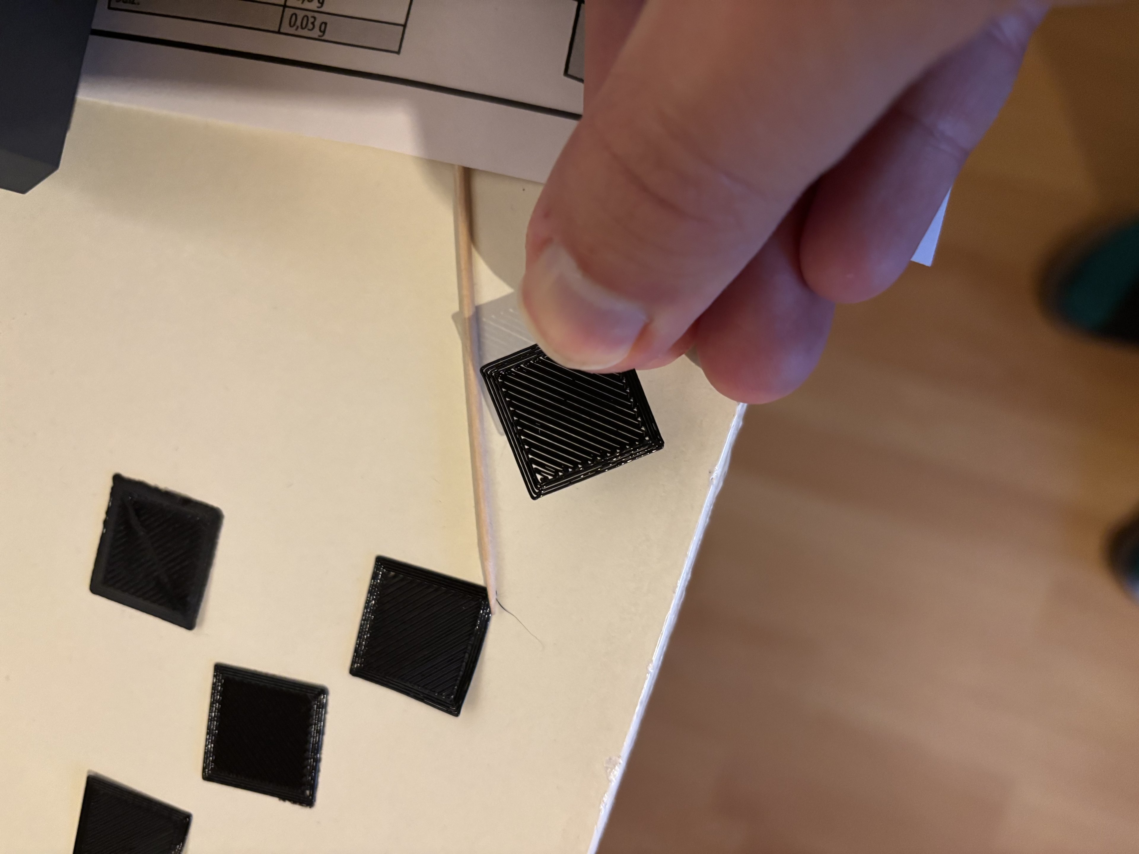 Mache ich nun einen Testdruck (1 Layer, 20mm² Viereck in allen Ecken und der Mitte) spielt sich folgendes ab: