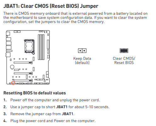 Um das BIOS zu resetten, muss man das Stromkabel vom Netzteil trennen, da ansonsten das BIOS selbst im ausgeschalteten Zustand über eine immer anliegende Standby-Spannung versorgt wird.