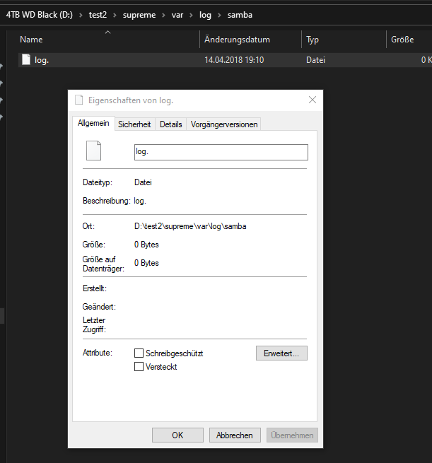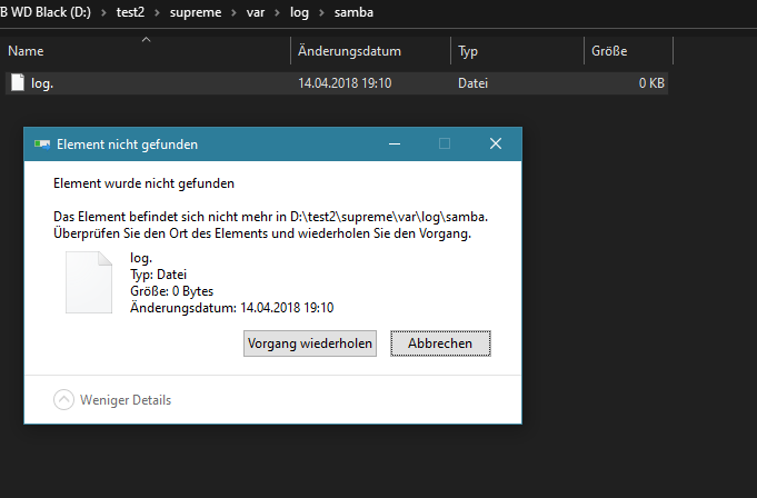 Gibts in dem Ordner noch was, das behalten werden soll? Wenn nicht, in der Eingabeaufforderung mit Adminrechten den übergeordneten Ordner mit Rd /s /q D:\test2\supreme\var\log\samba löschen. Denn RD interessieren Dateien in dem Ordner normalerweise nicht, solange sie nicht vom System gesperrt sind.