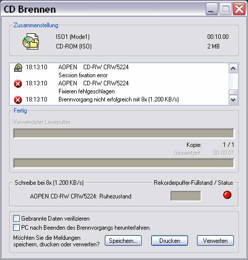 " Also, ich hab 'ne CD gebrannt bevor ich meinen alten Rechner weggegeben habe. Hab mit einem 4fach HP-Brenner gebrannt und vermutlich vergessen (bei Nero) da einzustellen die CD abzuschliessen. Und jetzt versuche ich sie abzuschliessen aber der kann die nicht fixieren. Es kommt die untere Meldung im Bild. Die gebrannten Dateien (die schon auf der CD waren) kann ich sehen. Aber nicht kopieren.