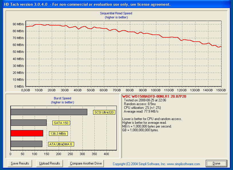Zurück zum HD tach. Ich wollte es kaum glauben, doch die Maxtor hat einen wesentlich höheren burst-speed als meine Raptor. Schaut euch mal die Screenshots von HD tach an. Spinnt das Tool?