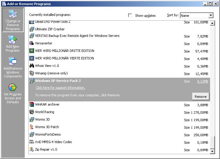 Du kannst das SP2 aber manuell deinstallieren, per Aufruf von C:\WINDOWS\$NtServicePackUninstall$\spuninst\spuninst.exe