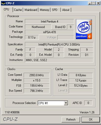 Also folgendes.Ich habe seit Mai 2004 das IntelD875PBZ(Bios Version P33) und den Northwood P4 mit 3ghz.Vor 2 Tagen habe ich meine 2 CorsairsXLS CL2 (je 2x256mb DDR Pc3200 und lief über AUTO auf CL2.5 3-3-8) ausgebaut und mir 2x 512mb(CL 2.5 3-3-8) von MDT gegönnt.Davor hatte ich immer einen FSB von 800Mhz im CPU-Z unter der Verwenung der Corsair Speicher.Als ich den MDT Speicher einbaute und im Bios wie immer alles auf AUTO beruhte(habe wegen den agressiven Speichertimings schlechte Erfahrungen mit dem Board),zeigt mir CPU-Z immer 2993,50 MHz an und den FSB von 199,2Mhz sowie Busspeed von 798,2mhz.