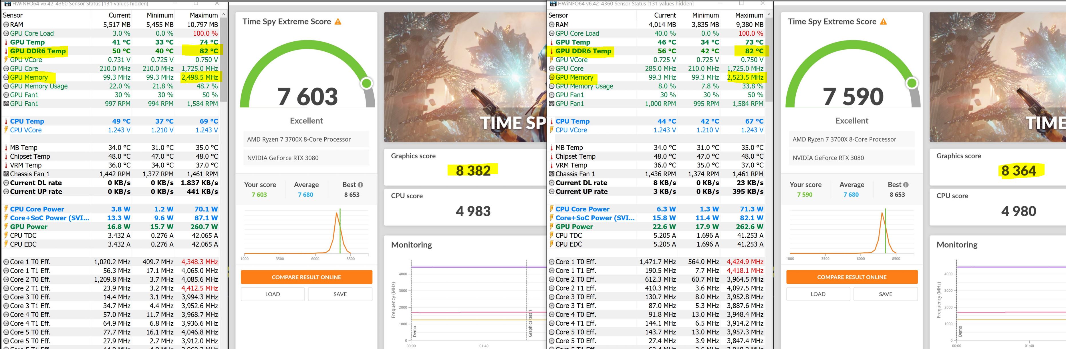 Dual FAN 3080 wird mit 1500 RPMs (48% Lüfterdrehzahl) und +500MHz auf dem Speicher überhaupt nicht kritisch warm, ganz im Gegenteil. Siehe Screenshots und hier sieht man auch ganz schön, dass bei +600MHz auf den Speicher anstelle 500MHz die Leistung zurückgeht. Deine +1500MHz sind garantiert drüber und du verlierst Leistung durch die Fehlerkorrektur möchte ich annehmen... Das könnte ich ausgleichen mit höherer VCore, aber das brauchts bei mir gar nicht.
