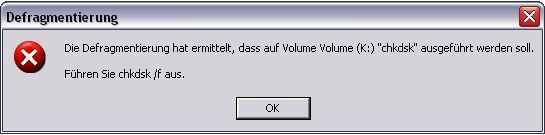 Hallo ich hab ein Problem ich habe einen Rechner bei dem Windows (Xp sp3) immer beim starten chkdsk ausführt auch kann ich diese Partition nicht mehr Defragmentieren es kommt immer die Fehlermeldung (siehe bild). Selbst wenn ich das mache was dort steht, also die chkdsk ausführe kommt diese Fehlermeldung immer noch. Könnt ihr mit bitte helfen komme nämlich nicht weiter