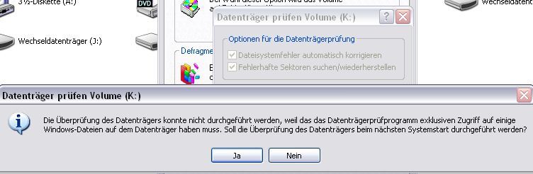 so ich hab jetzt das programm das CBase64 vorgeschlagen hat installiert und mit dem funktioniert es auch aber das problem ist das es mit dem defrag tool von windows immer noch net geht kommt selbe fehlermeldung, auch das xp bei jedem start immer noch chkdsk ausführt ist nicht so toll dann zu dem teil mit den beiden häckchen da kommt eine fehlermeldung und zwar diese(bild) und wenn man nein klickt kommt nur noch konnte nicht gemacht werden toll und jetzt? bei ja selbes ergebnis mit neustart