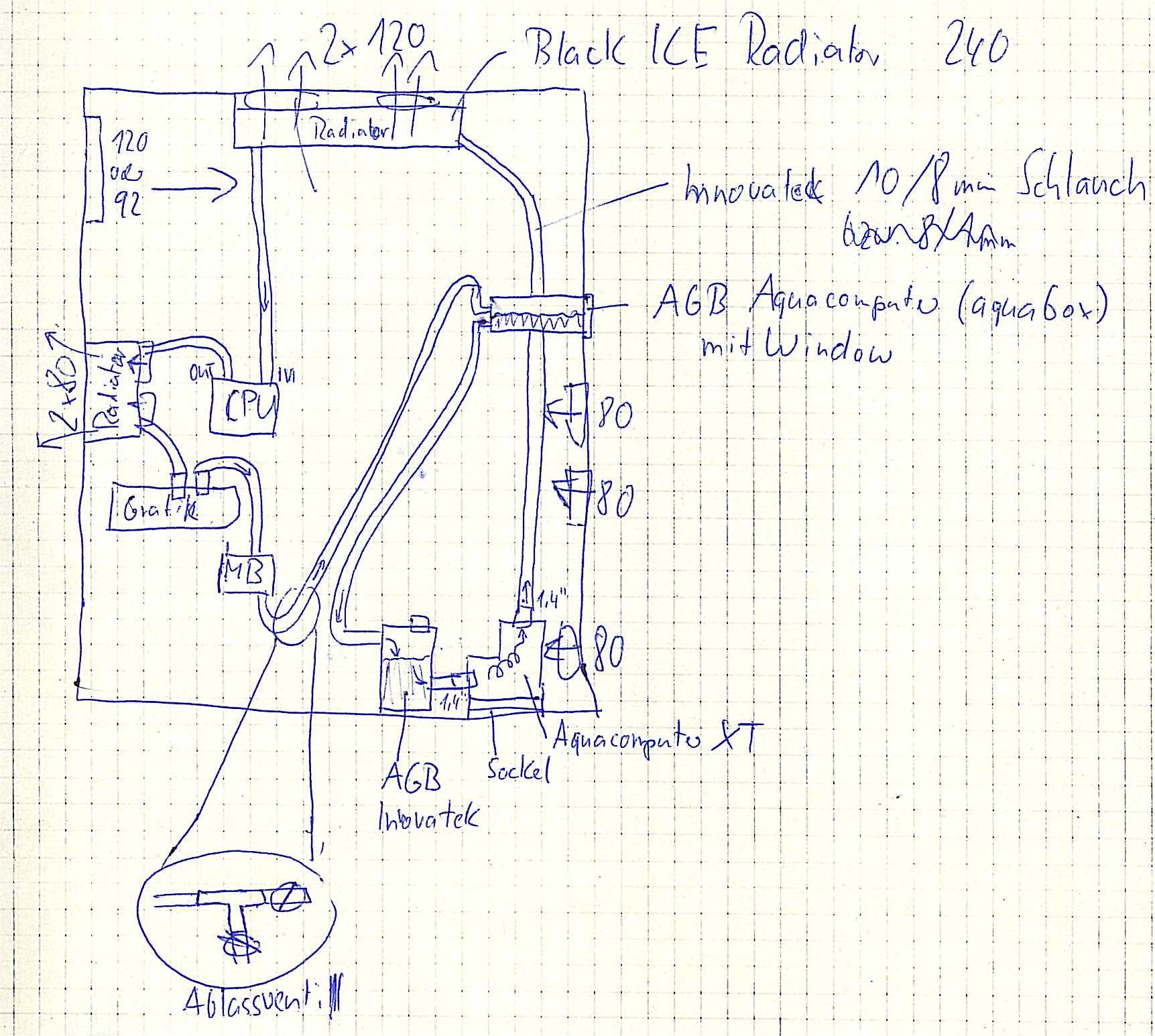 Wie man sieht läuft bei diesem bild das kühlwasser von der pumpe über den Radiator 1 dann zu der CPU dann Raidiator 2 (bietet sich an ich da eh lüfter habe und ich beim Radiator 1 nichts größeres als einen 240er verbauen möchte, nennen wir es mal eine redundante lösung) von dort in die graka und schliesslich über den MB-Cipsatz (noch nicht endgültig, aus kostengründen wohl eher nicht). Von da an ergibt sich nun etwas besonderes. Statt das hier das kühlwasser direkt in den AGB vor der pumpe fliesst, fliesst es erst in einen AGB in einem 5 1/4 zoll schachte. Hier stelle ich mir vor so etwas wie die Aquabox von aquacomuter installieren. Finde das teil absolut schön und würde bestimmt gut aussehen, wenn man sonnst nicht weis das eine wakü verbaut ist. Schliesslich ist das komplette system geschlossen. Von diesem punkt läuft es dann in den AGB (das billigste daher wohl den von innovatek denn man an die pumpe anschrauben kann).