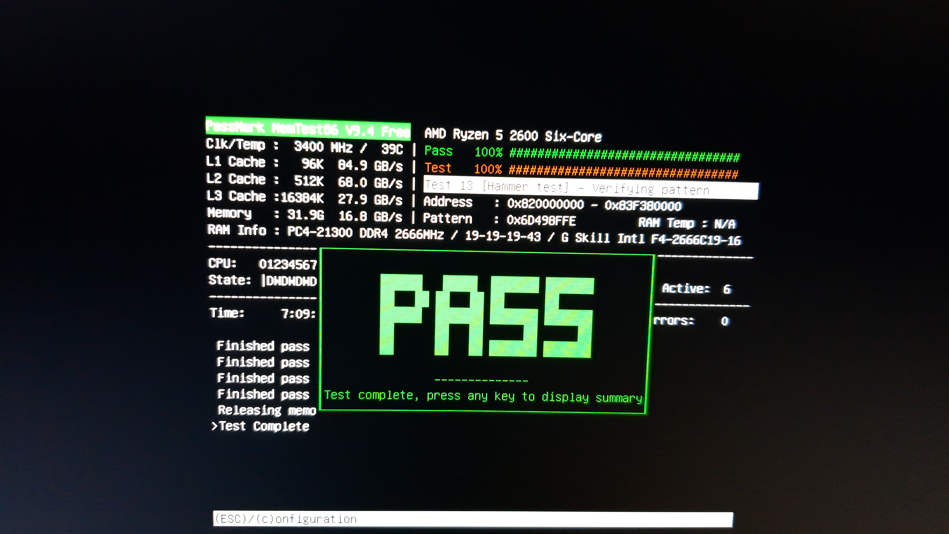 Guten Morgen, hier das erste mem-86-Testergebnis mit den ausgetauschten RAM´s. Kein Fehler. Der Test hat allerdings 7 Stunden gedauert. Die Test-RAM´s haben aber auch die doppelte Leistung (2 x 16 GB).