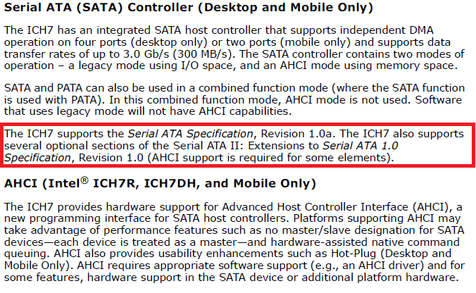 Vielleicht ist es auch so ähnlich wie bei SB-E und PCIe. Wurde einfach nicht vernünftig getestet und somit nicht offiziell angegeben. (Bin grad zu faul die Releases von ICH7 und SATA 2.0 zeitlich mal zu vergleichen.)