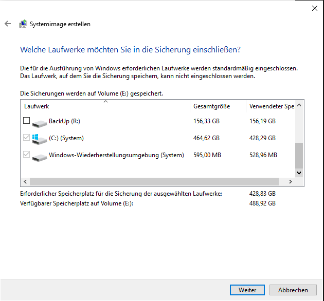 Davor wollte ich aber sicherheitshalber ein Backup erstellen. Meine 500GB M.2 (C: ) hat eine tatsächliche Gesamtkapazität von 464GB (belegt: 427,7GB) bzw.: