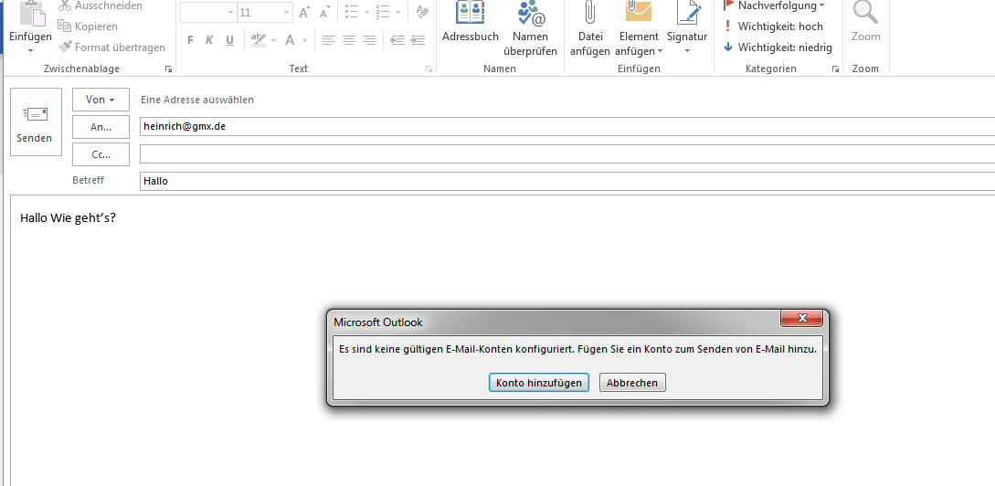 "Es sind keine gültigen e mail konten konfiguriert fügen sie ein konto zum seneden von email hinzu exchange."