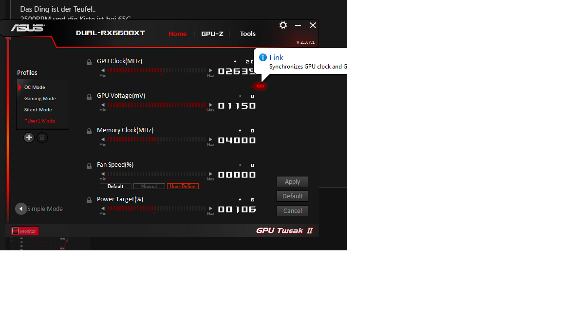 Karte bleibt bei ca 65c maximal aber ich habe beide Fans bei 2200-2400 was man eben deutlich hört.