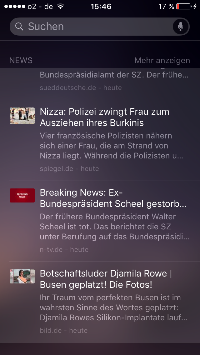 Ich gucke gerne mal in die Liste der News, die Siri bzw. Spotlight vorschlägt wenn man vom ersten Homescreen aus nach rechts wischt. Allerdings finden sich in der Liste auch einige Störelemente. Spezifisch geht es um Inhalte der Bild-"Zeitung".