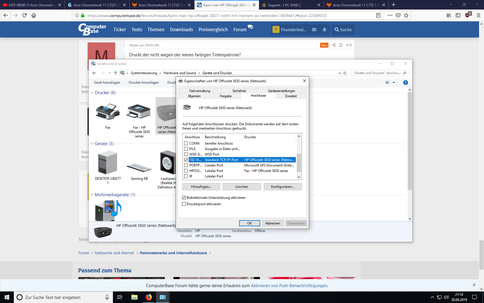 Ganz grob haben wir bei den Anschlüssen in den Druckereigenschaften die IP Adresse eingegeben und den Port zugewiesen. Oder sowas in der Art. Ich bitte um Entschuldigung, mir fällt es nicht so einfach zu erklären, Vieleicht kommt ihr ja drauf. Aber wir haben irgendetwas an den Ports gemacht und dann hat es funktioniert.