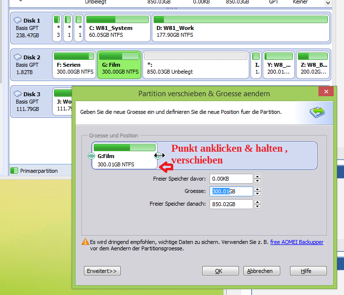 Dann Bild 2 deine PArtition F: wählen und in Bild 3 den rechten Punkt an der Partition anklicken und halten, nach rechts bis zum Ende verschieben.